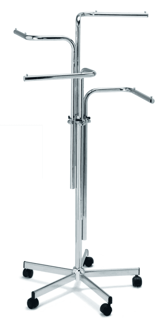Der höhenverstellbare Abhängeständer mit 4 geraden Armen bietet eine vielseitige Möglichkeit, Ihre Kleidungsstücke in einer eleganten und praktischen Art und Weise zu präsentieren. Mit seinen geraden Armen, der praktischen Höhenverstellbarkeit durch Schlauchklemmen, den Rollen und der verchromten Oberfläche stellt dieser Ständer eine flexible Lösung dar, um Ihre Modekollektion stilvoll zur Schau zu stellen.