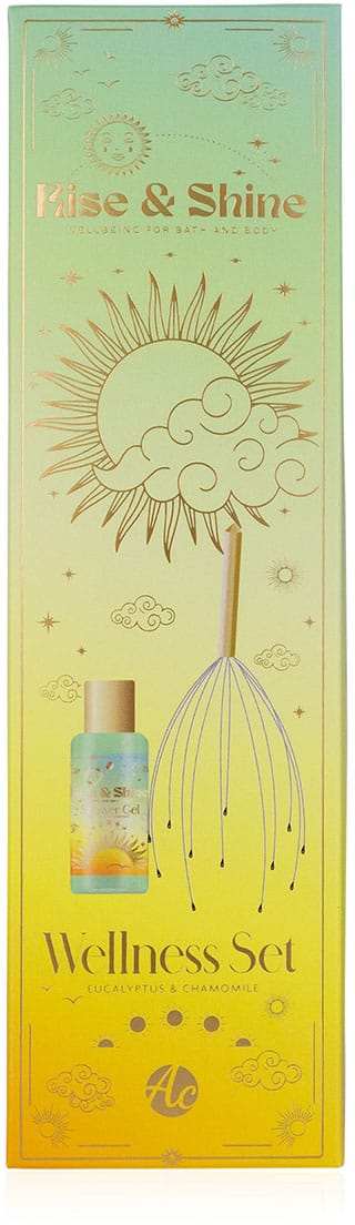 Entspannen Sie mit dem Wellness-Set RISE & SHINE. Enthält 100 ml Duschgel mit Eucalyptus & Kamille Duft und ein Kopfmassagegerät für wohltuende Entspannung. Ideal für eine Auszeit vom Alltag!