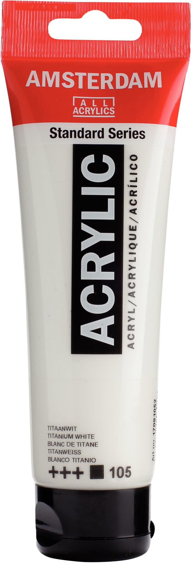 Entdecken Sie die Amsterdam Standard Series 105 – Titanweiss, eine hochdeckende Acrylfarbe mit herausragender Lichtechtheit (+++). Mit der umfangreichsten Palette an lebendigen Acrylfarben bietet unsere Standardserie einzigartige Farben für Ihre Kunstprojekte. Die vielseitige Farbe ist einfach zu handhaben und ermöglicht ein müheloses Auftragen. Sie kann pur aus der Tube verwendet oder mit Wasser oder Malmitteln verdünnt werden.
