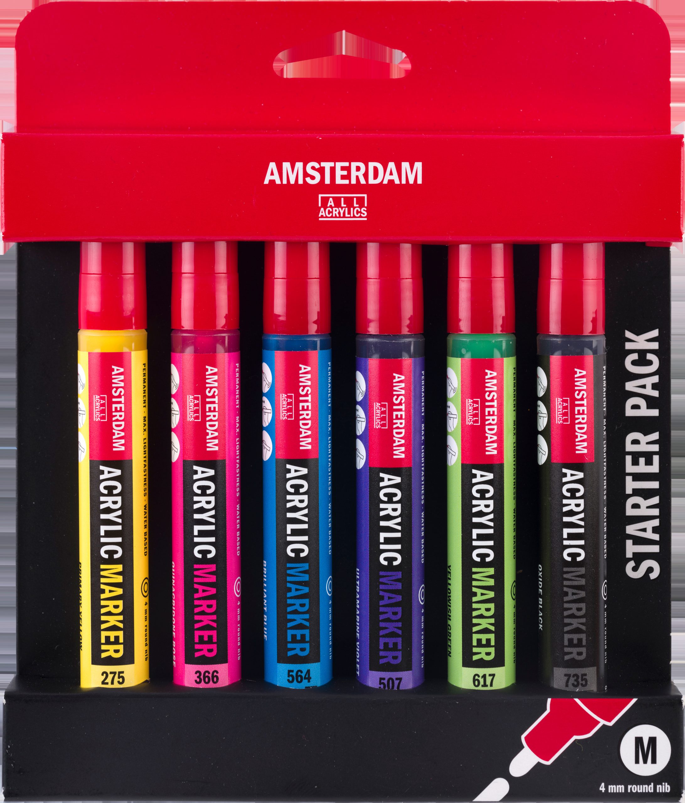 Dieses Einsteigerset eignet sich ideal, um mit den Amsterdam Acrylmarkern zu beginnen. Das Set enthält 6 Marker mit einer mittelgrossen, runden Spitze (4 mm) in Basisfarben. Inhalt: 6 Marker (275 Primärgelb ? 366 Chinacridonrosa ? 564 Brillantblau ? 507 Ultramarinviolett ? 617 Gelbgrün ? 735 Oxidschwarz). Amsterdam Acrylmarker Unsere Acrylmarker bieten eine einfache Lösung, um deutliche Linien zu ziehen und deinem Acrylgemälde den letzten Schliff zu geben. Verwende diese Marker, um Strichzeichnungen und Skizzen zu erstellen und um schnell Farbakzente direkt auf deiner Arbeit zu setzen. Schüttle den Marker vor dem Gebrauch mit aufgesetzter Kappe, damit die Tinte zu fliessen beginnt und sich die Farbe mit dem Bindemittel vermischt. Halte den Marker aufrecht und drücke auf die Spitze, um den Innendruck abzubauen. Die Tinte beginnt zur Spitze zu fliessen, und dein Marker ist einsatzbereit. Setze die Kappe nach dem Gebrauch wieder fest auf und lagere den Marker waagerecht. Hergestellt mit hochwertigen, lichtechten Pigmenten Die geruchsneutrale, wasserbasierte Formel wird nach dem Trocknen wasserfest und dauerhaft Umfangreiche Palette von 46 Farben mit einer grossen Vielfalt an verschiedenen Deckgraden, einschliesslich Reflex- und Metallic-Tönen In 3 verschiedenen Grössen erhältlich (2 mm runde Spitze, 4 mm runde Spitze, 15 mm quadratische Spitze) und dadurch sehr vielseitig Beidseitig verwendbare, austauschbare Spitzen sorgen für eine besonders lange Lebensdauer (zusätzliche Spitzen separat erhältlich) Einfach in der Anwendung und haftet auf praktisch allen leicht porösen Oberflächen, einschliesslich Leinwand, Papier, Pappe, Holz, Stein und Beton Mit Stolz in Europa hergestellt