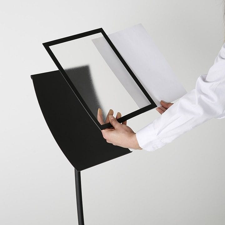 Das Arc Menuboard findet Anwendung in Banken, Hotels, Restaurants, Cafés und anderen Unternehmen als Werbe- oder Informationsmittel. Dabei bietet die flexible Größenoption von A3 und A4 sowie die Möglichkeit der Präsentation im Quer- oder Hochformat vielseitige Einsatzmöglichkeiten.