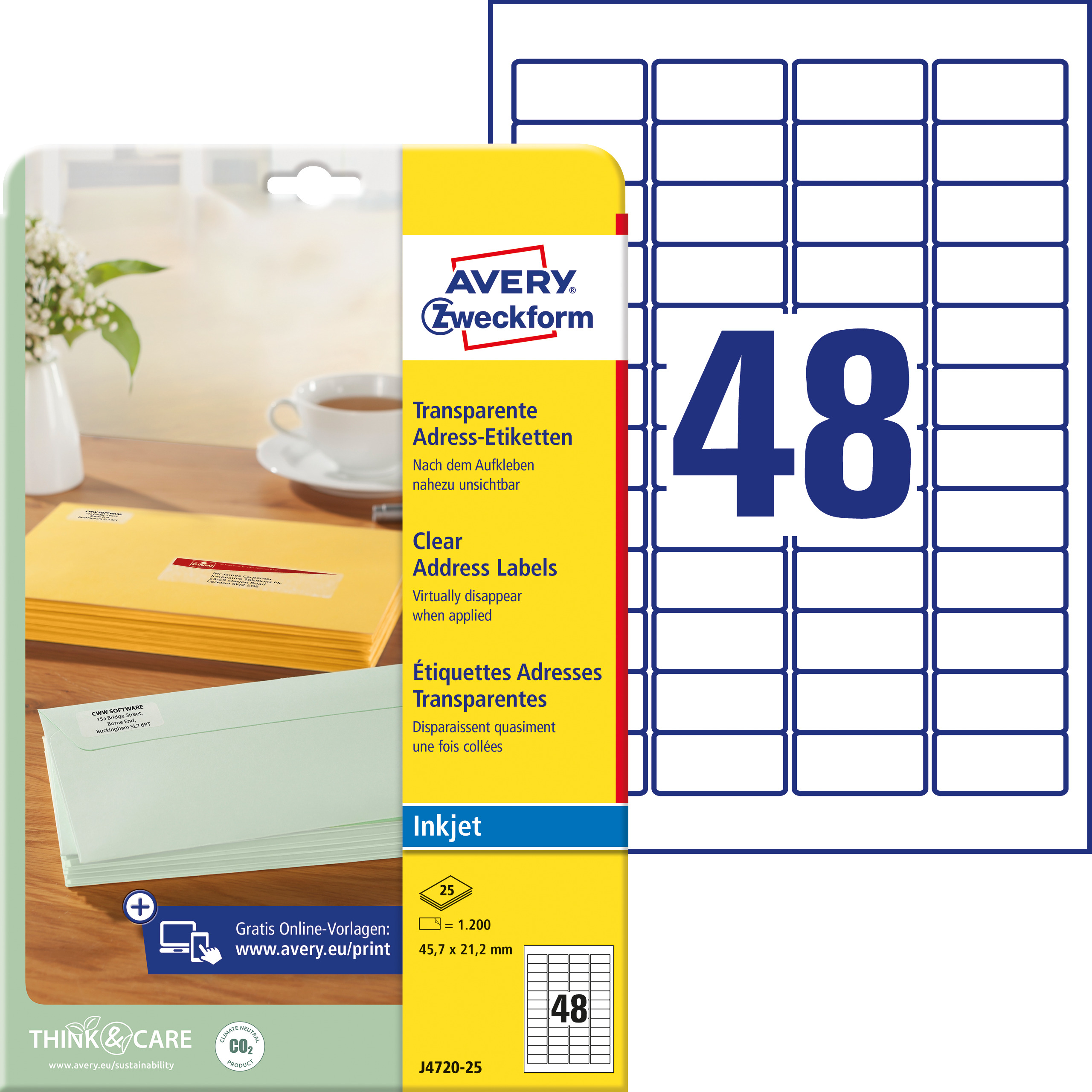 Die AVERY ZWECKFORM Etiketten J4720-25 sind transparente, selbstklebende Etiketten in der Grösse 45,7×21,2mm, ideal für Beschriftungen und Organisation mit 1200 Stück pro Packung.
