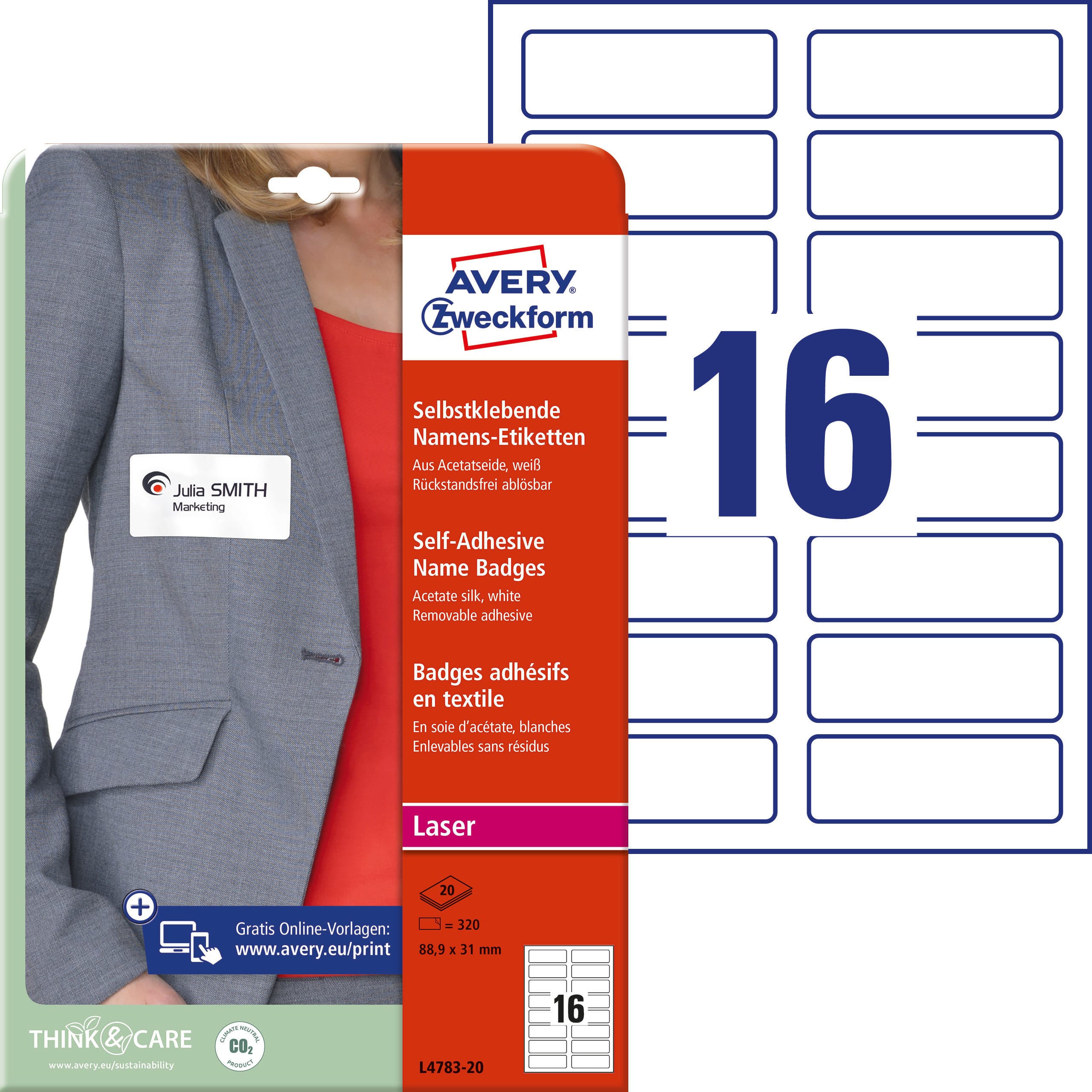 Mit den hochwertigen Avery Zweckform L478X Namensetiketten wird die Organisation von Veranstaltungen, Seminaren und Konferenzen zum Kinderspiel. Die selbstklebenden, ablösbaren Textil-Etiketten im Format 88,9 x 31 mm bieten mit 320 weissen Etiketten auf 20 Bogen ausreichend Platz für personalisierte Namensschilder.