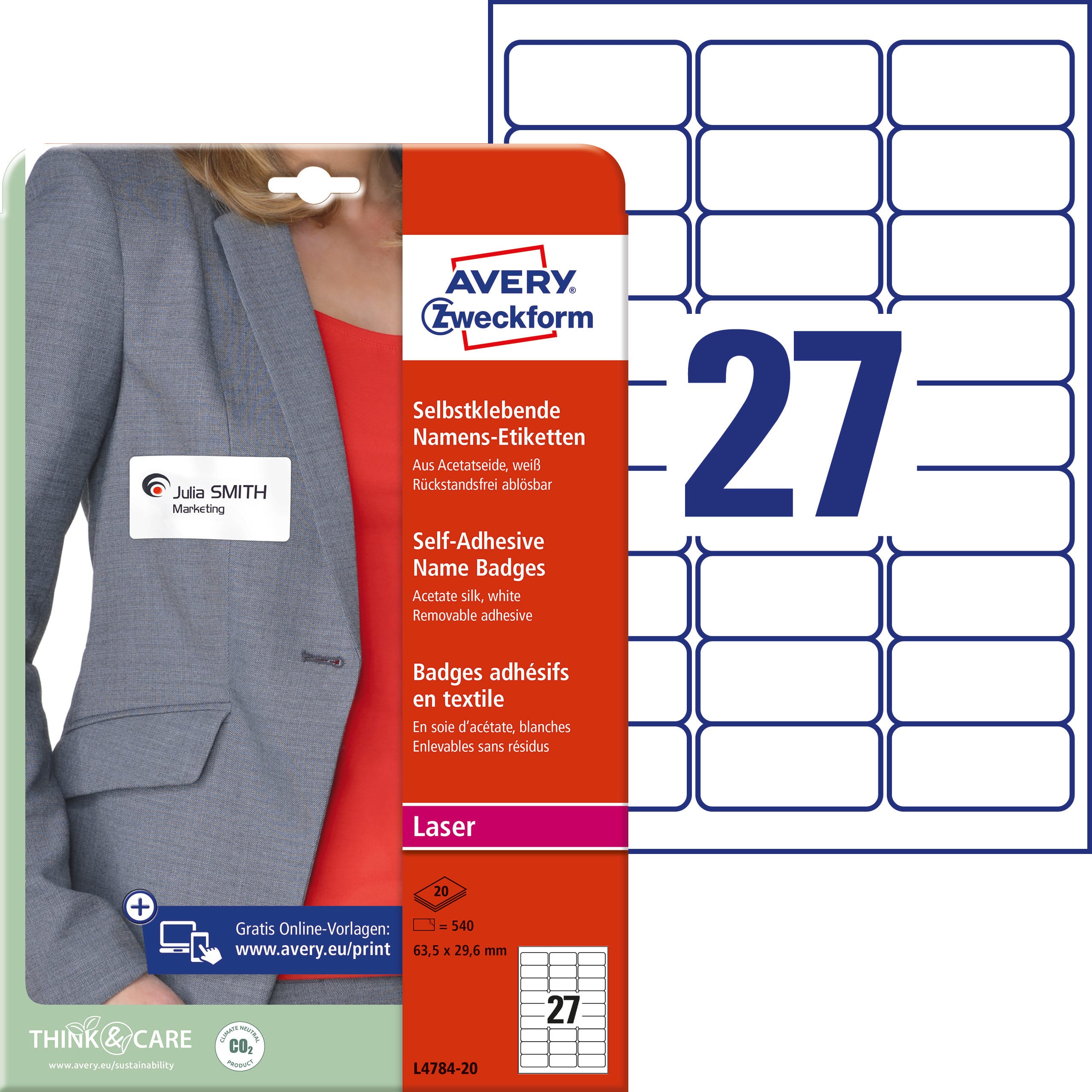 Die selbstklebenden Namensetiketten L4784-20 von Avery Zweckform sind die perfekte Lösung, um Veranstaltungen, Seminare und Konferenzen organisiert ablaufen zu lassen. Mit einem Format von 63,5 x 29,6 mm und insgesamt 540 weissen, bedruckbaren Textiletiketten auf 20 Bogen bieten sie optimale Voraussetzungen für eine gelungene Veranstaltung. Anders als herkömmliche Plastikschilder mit Nadel oder Clip haften diese Etiketten aus Acetatseide zuverlässig auf Kleidung und anderen Textilien, lassen sich jedoch rückstandsfrei ablösen. Die Namensschilder sind mit einer Rückseiten-Stanzung versehen, die ein leichtes Heraustrennen ermöglicht, sodass sie auch später wiederverwendet werden können.