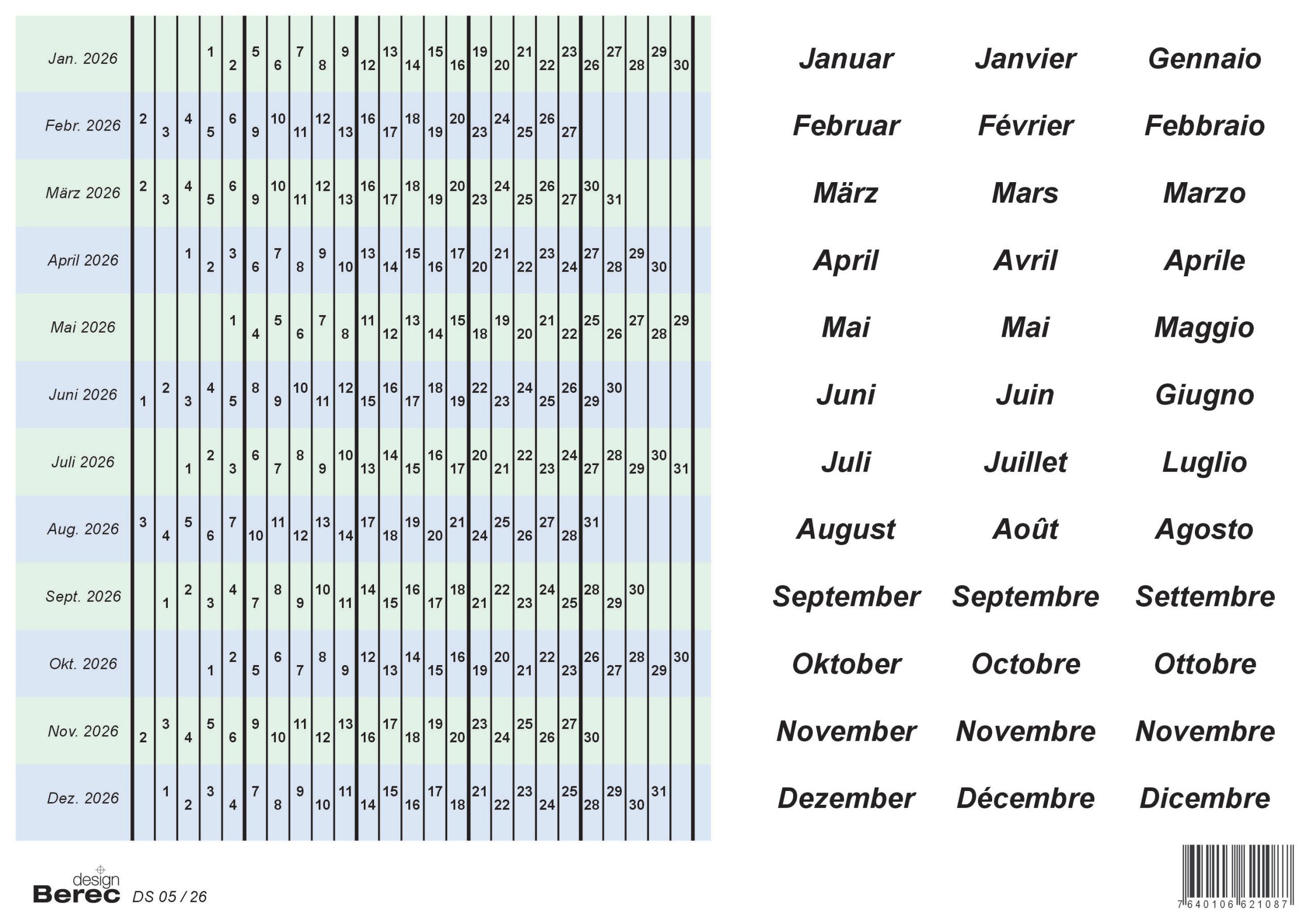 Sichern Sie sich jetzt das Datumsstreifenset von BEREC für das oder die kommenden Jahre. Es enthält kalendergerechte Datumstreifen mit farbig markierten Wochen.