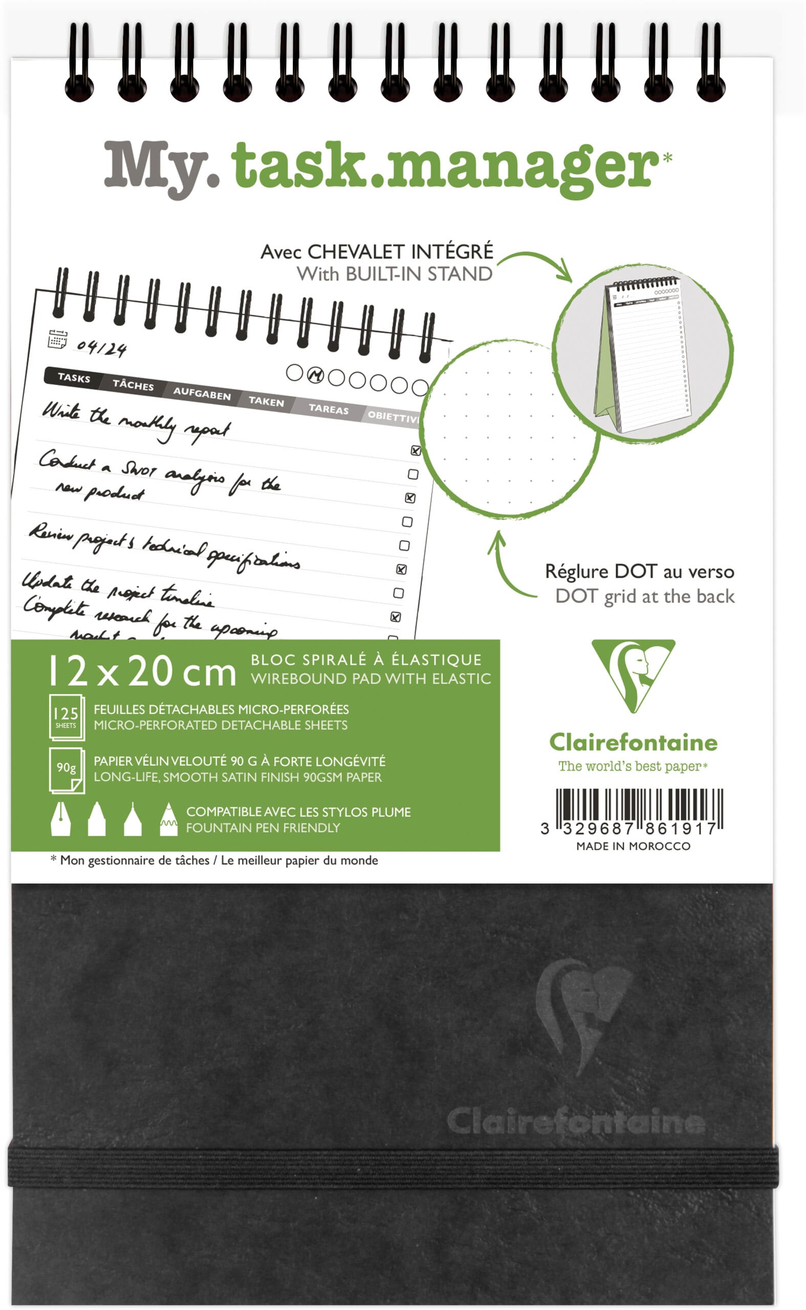 Mit dem AGE BAG – Task Spiralblock behältst du deine Aufgaben im Griff. 12×20 cm gross, 250 Seiten (125 Blatt) 90g mit Kontrollkästchen für Prioritäten und Fortschritt. Robuster Kartoneinband mit Gummizugverschluss, innen integriertem Aufsteller und PEFC-zertifiziertem Papier. Entwickelt und hergestellt in Frankreich.