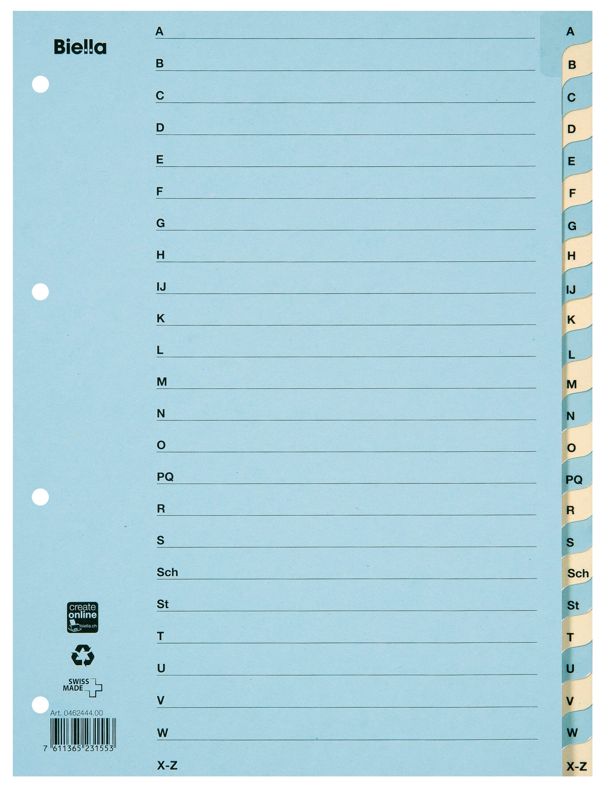 Die blau/gelben Farben der Taben sorgen für eine klare und übersichtliche Struktur. Durch die A – Z Einteilung finden Sie Ihre Unterlagen im Handumdrehen und sparen wertvolle Zeit bei der Suche.