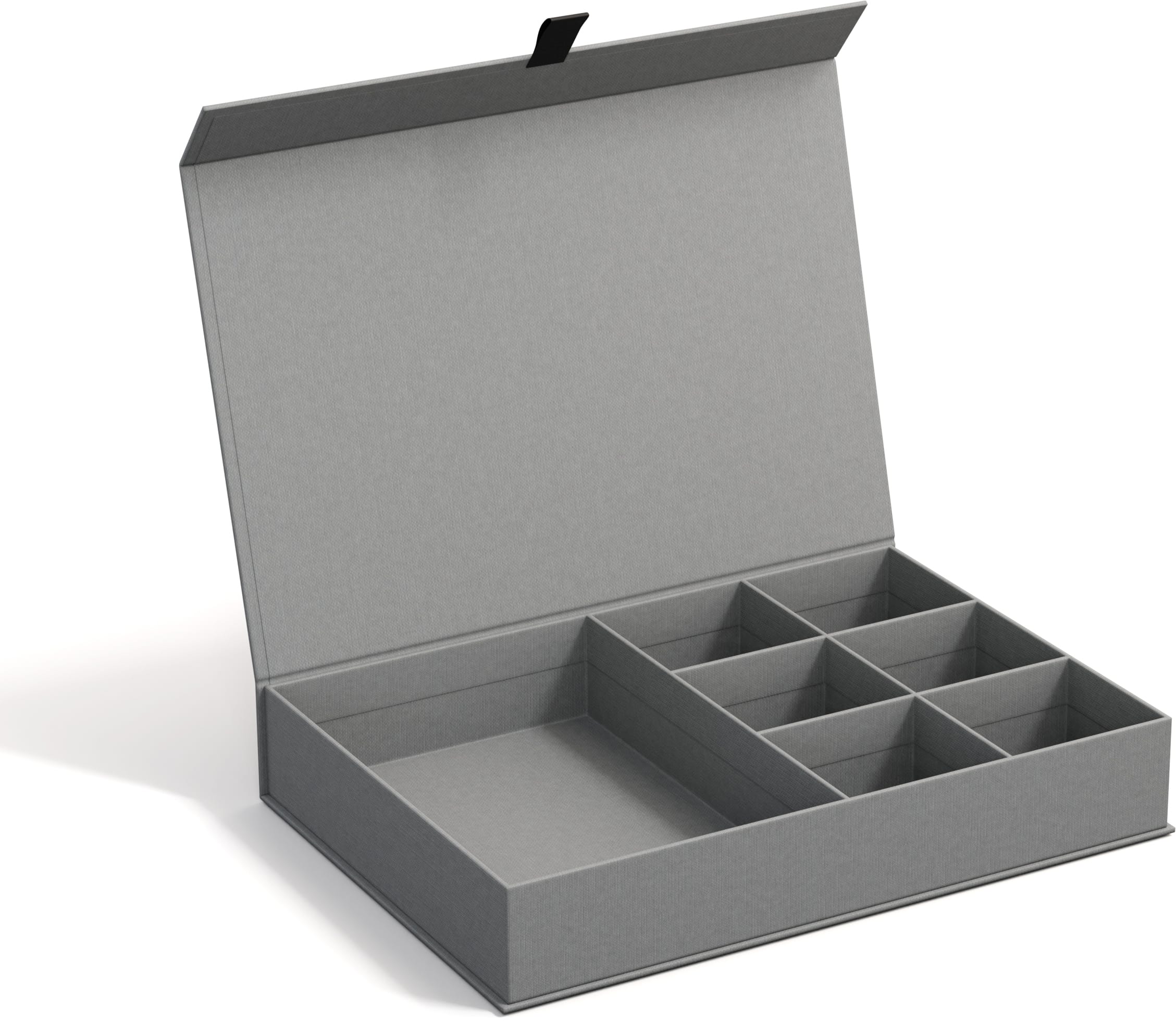 Die JOLIE Schmuckboxen bieten mit 7 Fächern ausreichend Platz für Ihre Juwelen und andere wertvolle Gegenstände. Der leicht zu öffnende Deckel mit Magnetverschluss schützt den Inhalt vor Staub und Kratzern, während die Einteilung in die verschiedenen Fächer es Ihnen ermöglicht, Ihre Schmuckstücke organisiert aufzubewahren. Egal ob Manschettenknöpfe, Halsketten, Armbänder, Ohrringe, Broschen oder Sonnenbrillen – hier findet jedes Lieblingsstück seinen Platz.