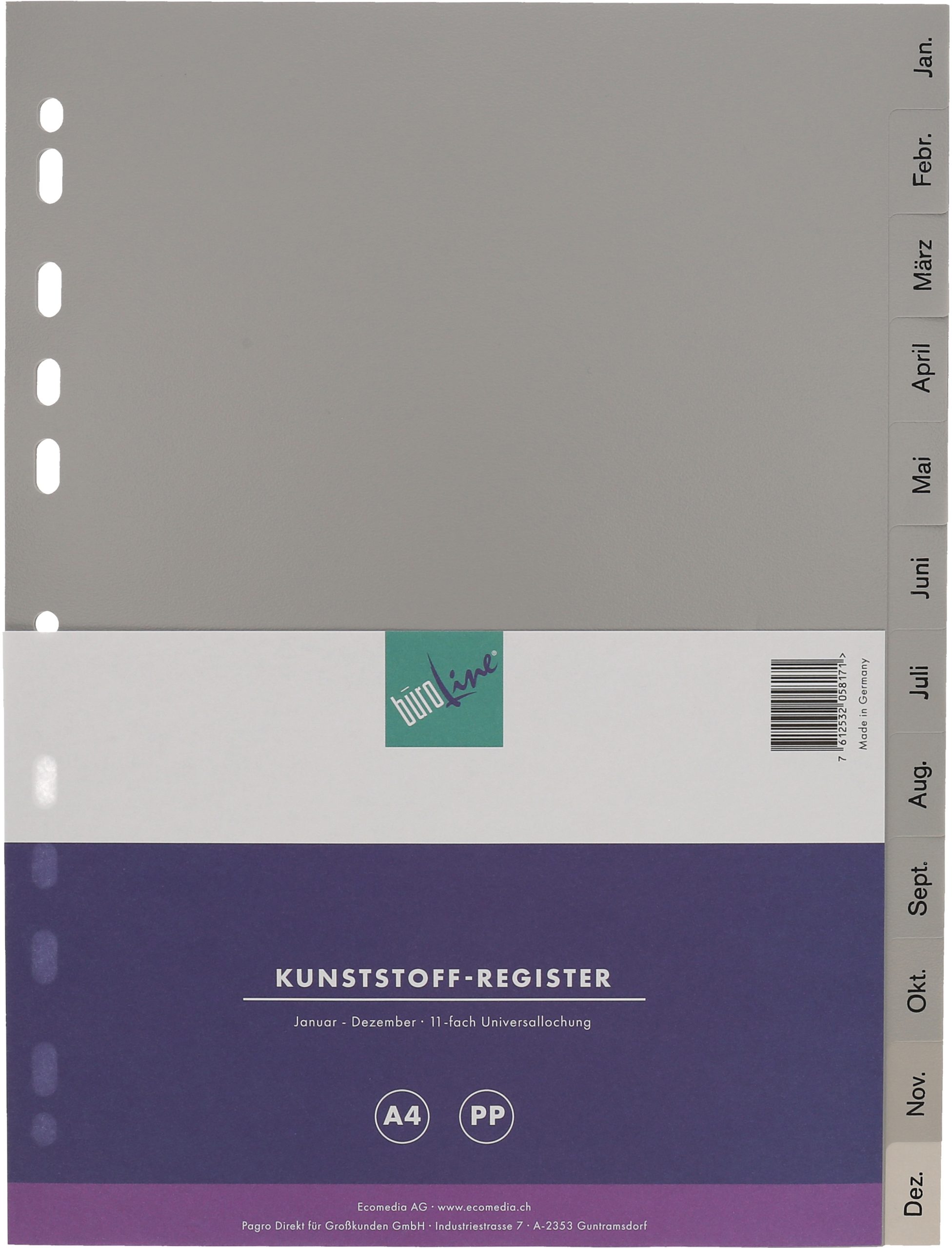 Das Register ist im Format A4 gehalten und verfügt über eine klare Monatsunterteilung von Januar bis Dezember. Diese übersichtliche Gliederung ermöglicht es Ihnen, Ihre Unterlagen nach Monaten zu sortieren und schnell auf die benötigten Dokumente zuzugreifen. Die graue Farbe bietet eine neutrale und elegante Optik, die sich nahtlos in jede Büroumgebung einfügt.