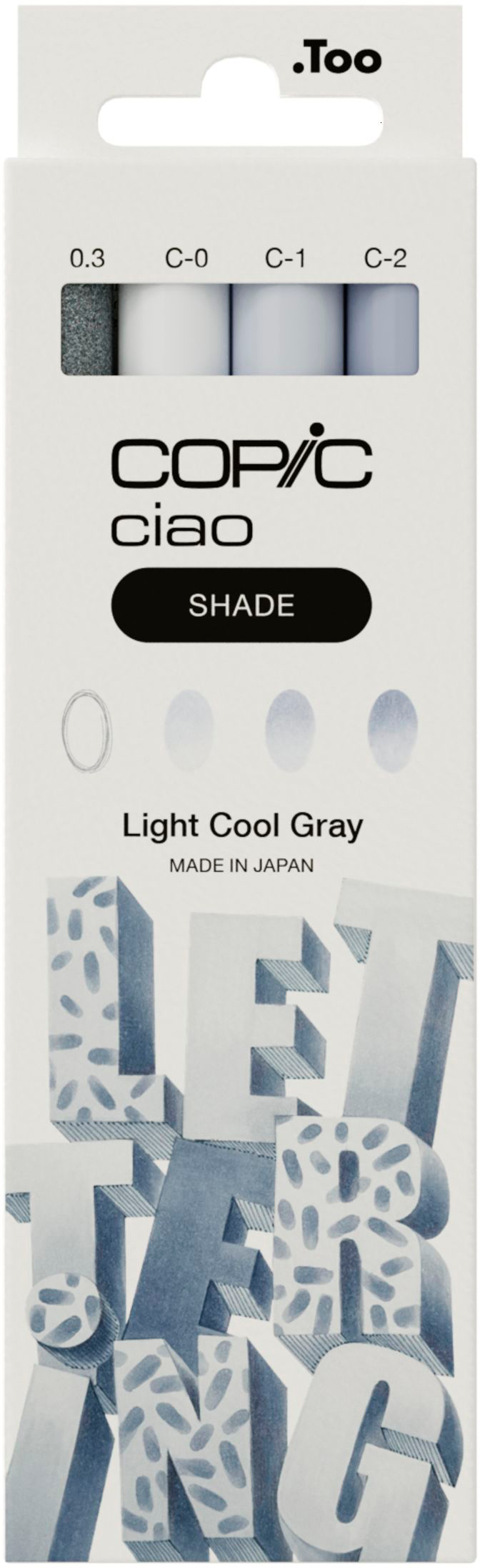 - Copic Ciao SHADE Set, Light Cool Gray, enthaltene Farben: Cool Gray No. 1, Cool Gray No. 0, Cool Gray No. 2, Multiliner Cool Gray 0.3 mm.