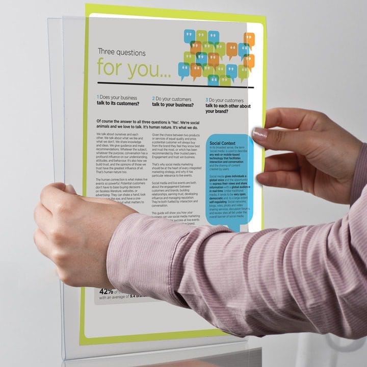 Der hoch resistente, antireflexe transparente PET Prospekthalter mit Klebestreifen bietet eine innovative Alternative zu herkömmlichen Klapprahmen. Ideal für die Präsentation von Speisekarten, Preislisten und anderen Informationen in geschäftlichen Umgebungen, zeichnet sich dieser Prospekthalter durch seine Vielseitigkeit aus.