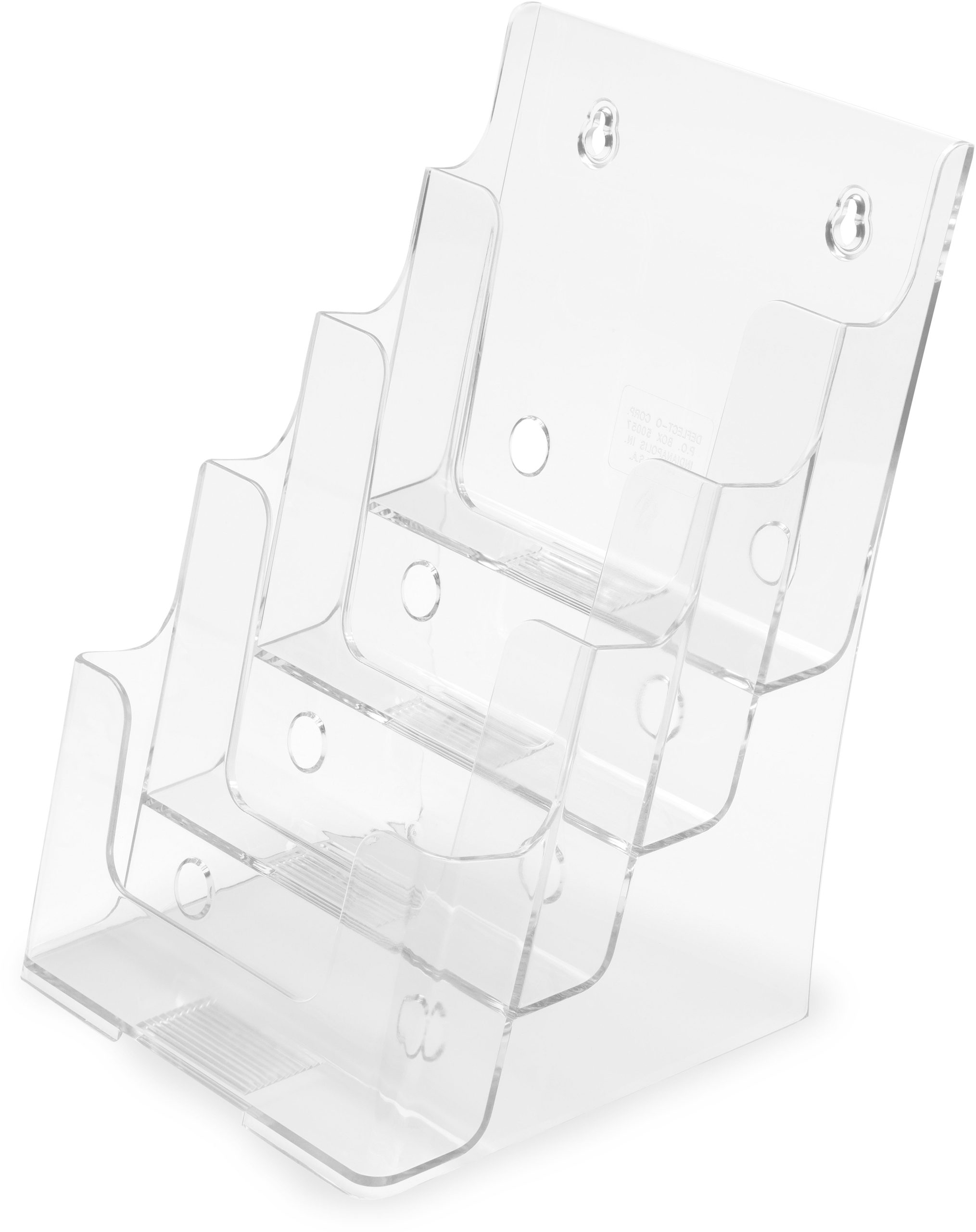 Mehrstufiger Prospekthalter für eine Vielzahl von Prospekten, spart wertvolle Standfläche. Abgeschrägt, für eine stabile Präsentation. So haben Sie Prospekte und Kataloge glasklar im Blickfeld. Wandmontage ebenfalls möglich. Material: Polystyrol transparent.