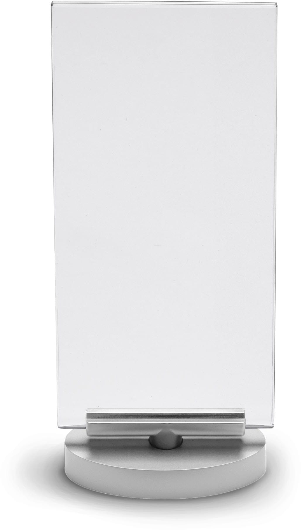 Möchtest du deine Informationen oder Werbebotschaften stilvoll präsentieren? Dann ist dieser drehbare Aufsteller mit eleganter silberner Basis genau das Richtige für dich. Egal ob im Büro, auf Messen oder in Geschäften, dieser Aufsteller zieht garantiert alle Blicke auf sich.