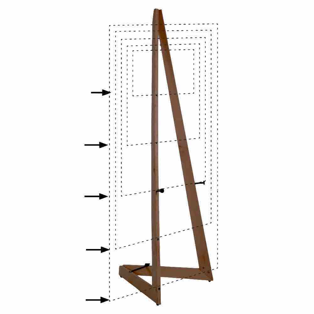 Die Höhenverstellung der Staffelei erfolgt mühelos und sicher dank des mobilen Zapfen-Systems. So können Sie die gewählte Höhe problemlos fixieren und eine stabile Präsentation gewährleisten.