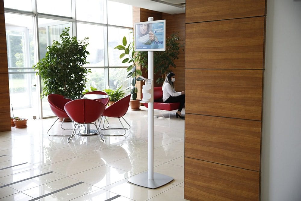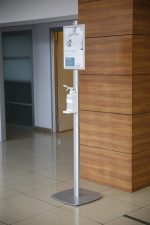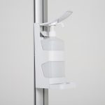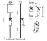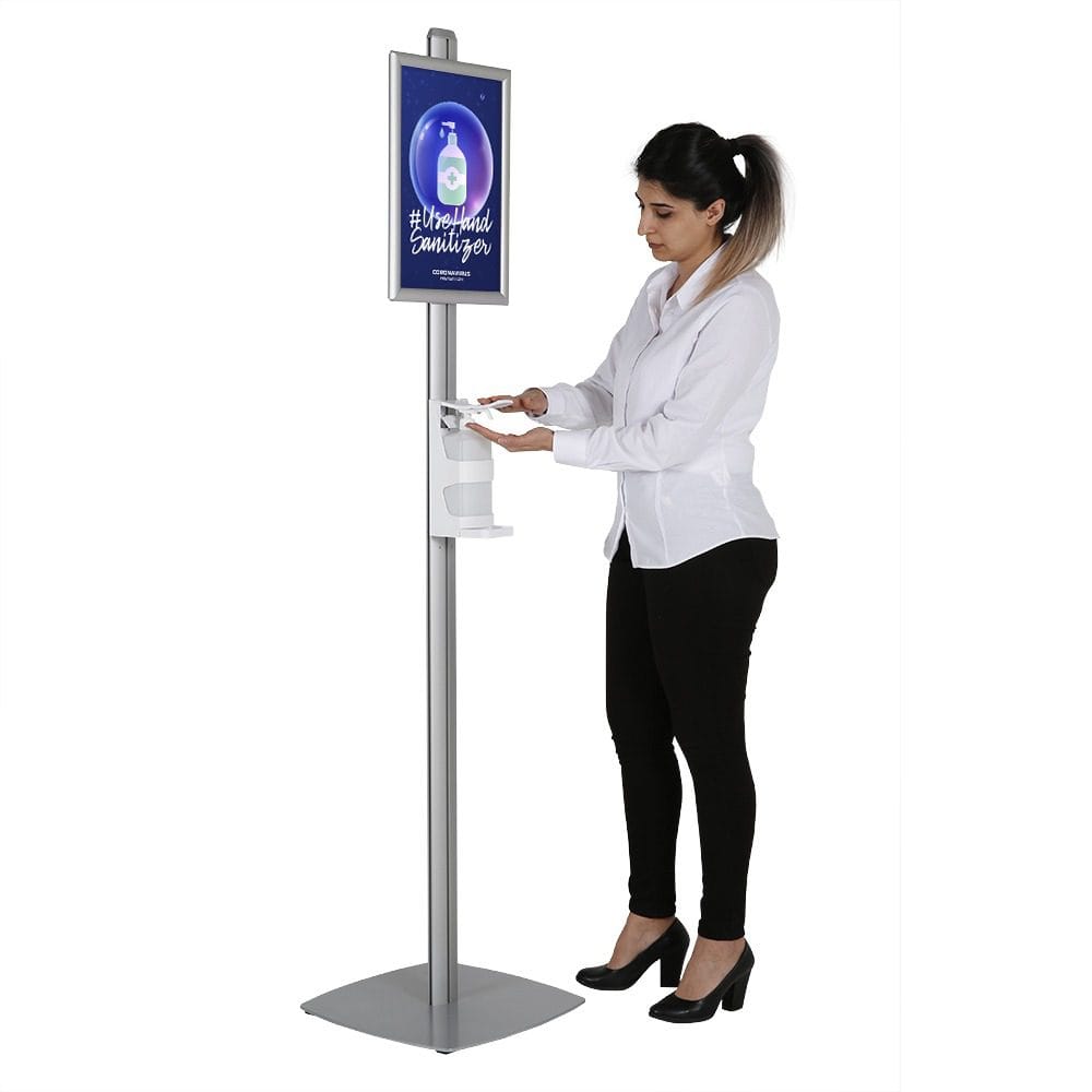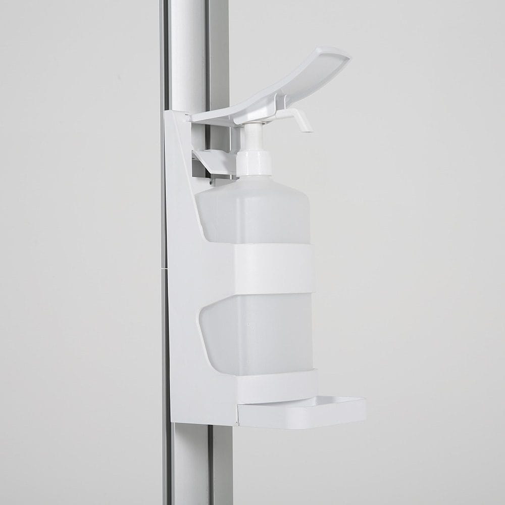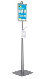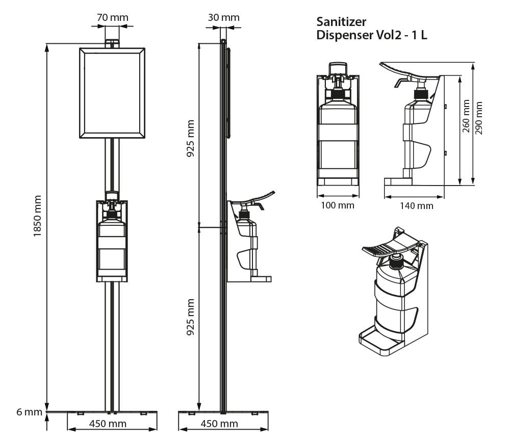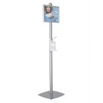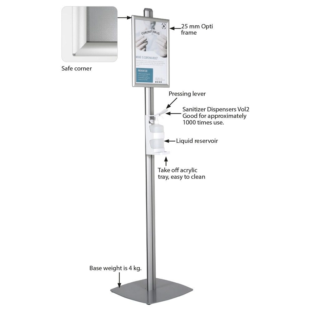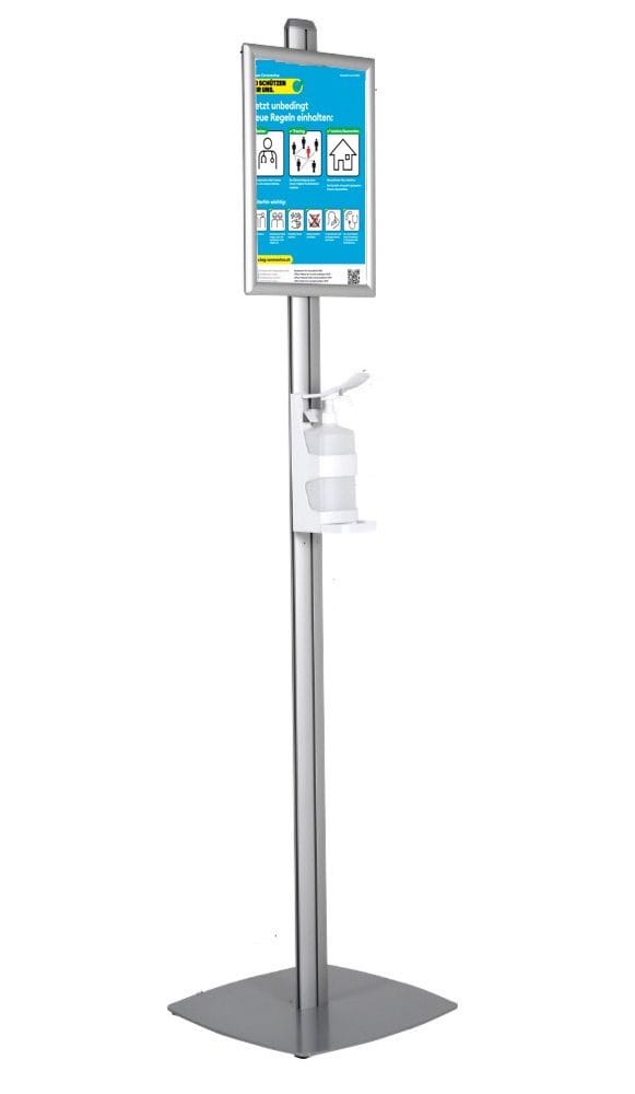 Der Desinfektionsspender besticht durch seinen Ständer aus hochwertigem Aluminium, der nicht nur moderne Eleganz verströmt, sondern auch für Robustheit und Langlebigkeit sorgt. Der integrierte Klapprahmen im A4-Format bietet die Option, wichtige Informationen oder Anweisungen anzuzeigen, was vor allem in öffentlichen Einrichtungen oder Unternehmen von großem Nutzen ist.