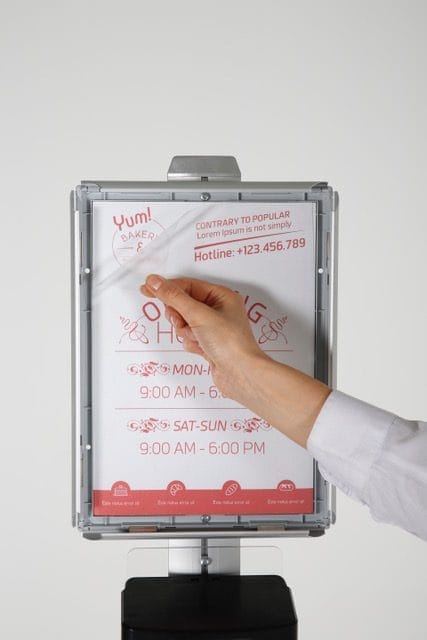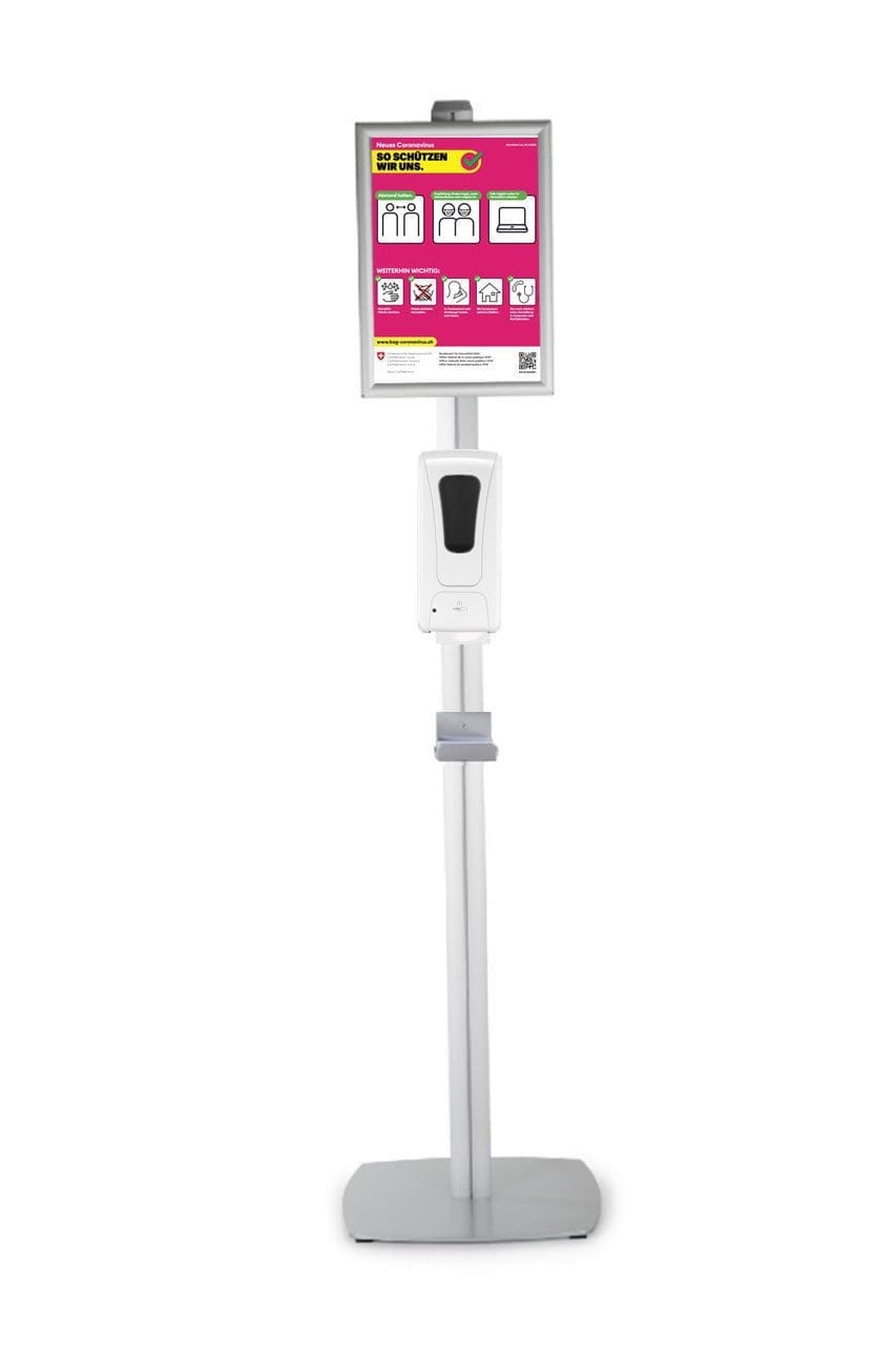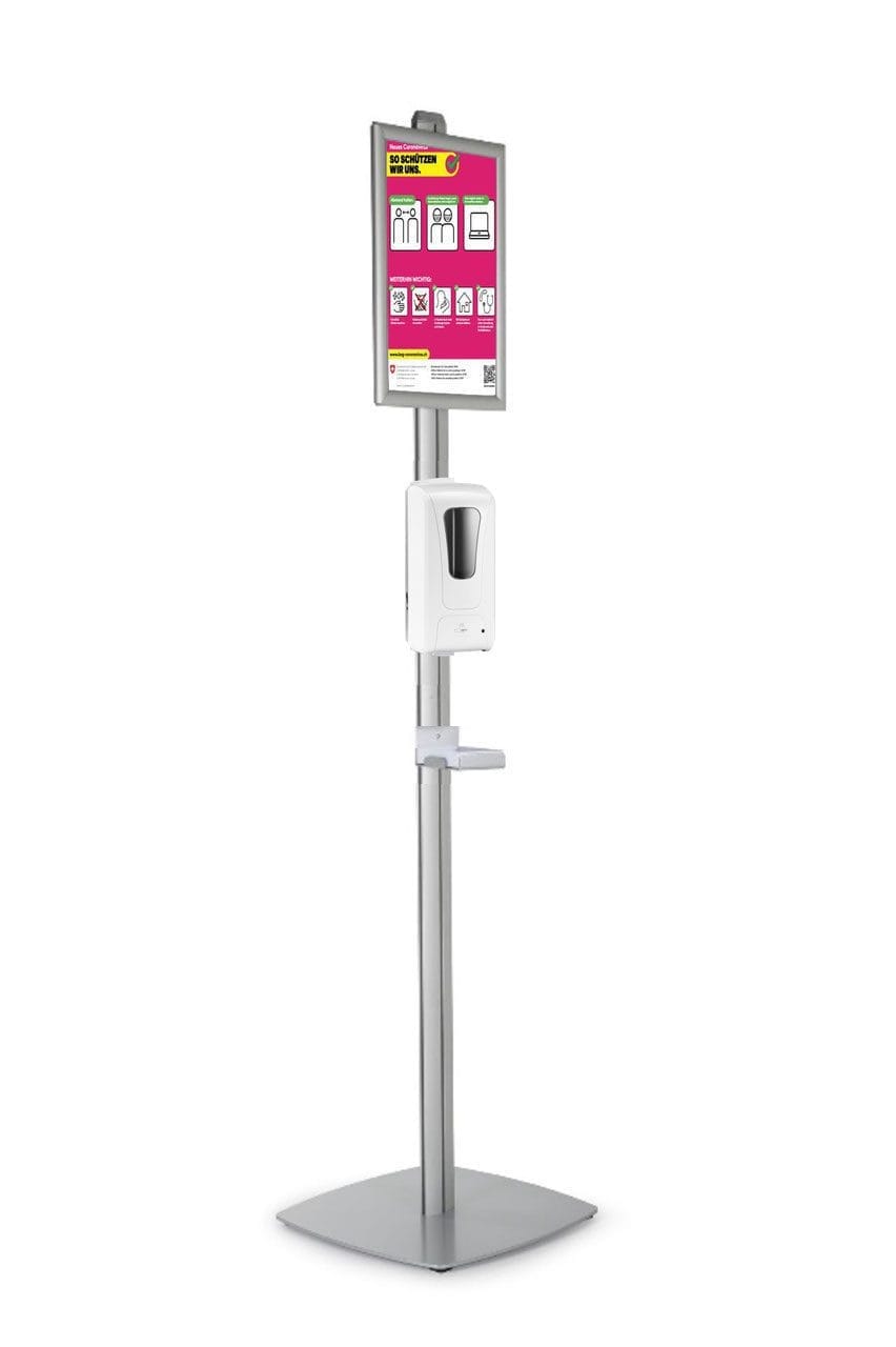 Der Ständer des Spendy Desinfektionsspenders besteht aus hochwertigem Aluminium, was nicht nur eine moderne Optik schafft, sondern auch Stabilität und Langlebigkeit gewährleistet. Der im Ständer integrierte Klapprahmen im A4-Format bietet die Möglichkeit, wichtige Informationen oder Anweisungen anzuzeigen. Dies kann in öffentlichen Einrichtungen oder Unternehmen von Vorteil sein, um auf Hygienerichtlinien oder andere relevante Informationen hinzuweisen.
