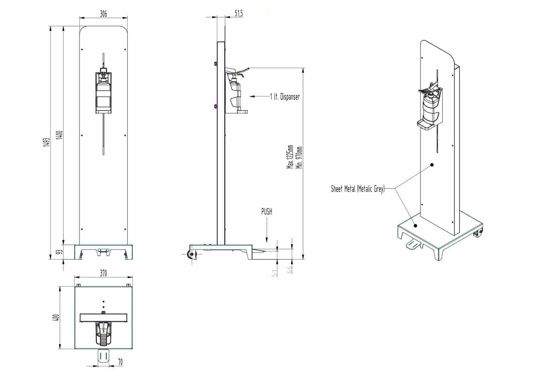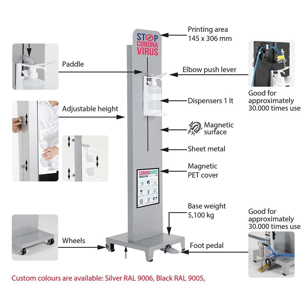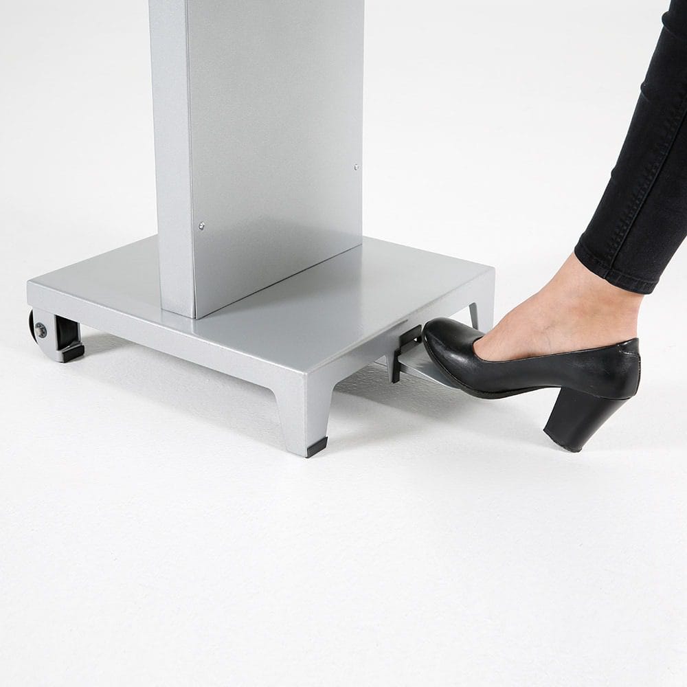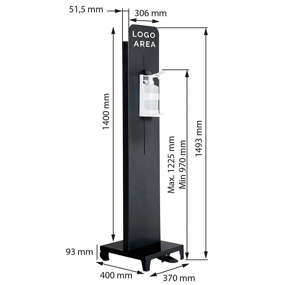 Die Höhe des Toto Desinfektionsspenders kann von 970 mm bis maximal 1225 mm einfach verstellt werden. Diese Anpassungsfähigkeit ermöglicht den Einsatz des Spenders an verschiedenen Orten, darunter öffentliche Einrichtungen wie Vorschulen, Kindergärten und Schulen. Die Vielseitigkeit des Spenders macht ihn zu einer nützlichen Ergänzung für Bereiche, in denen eine hygienische Umgebung von großer Bedeutung ist.