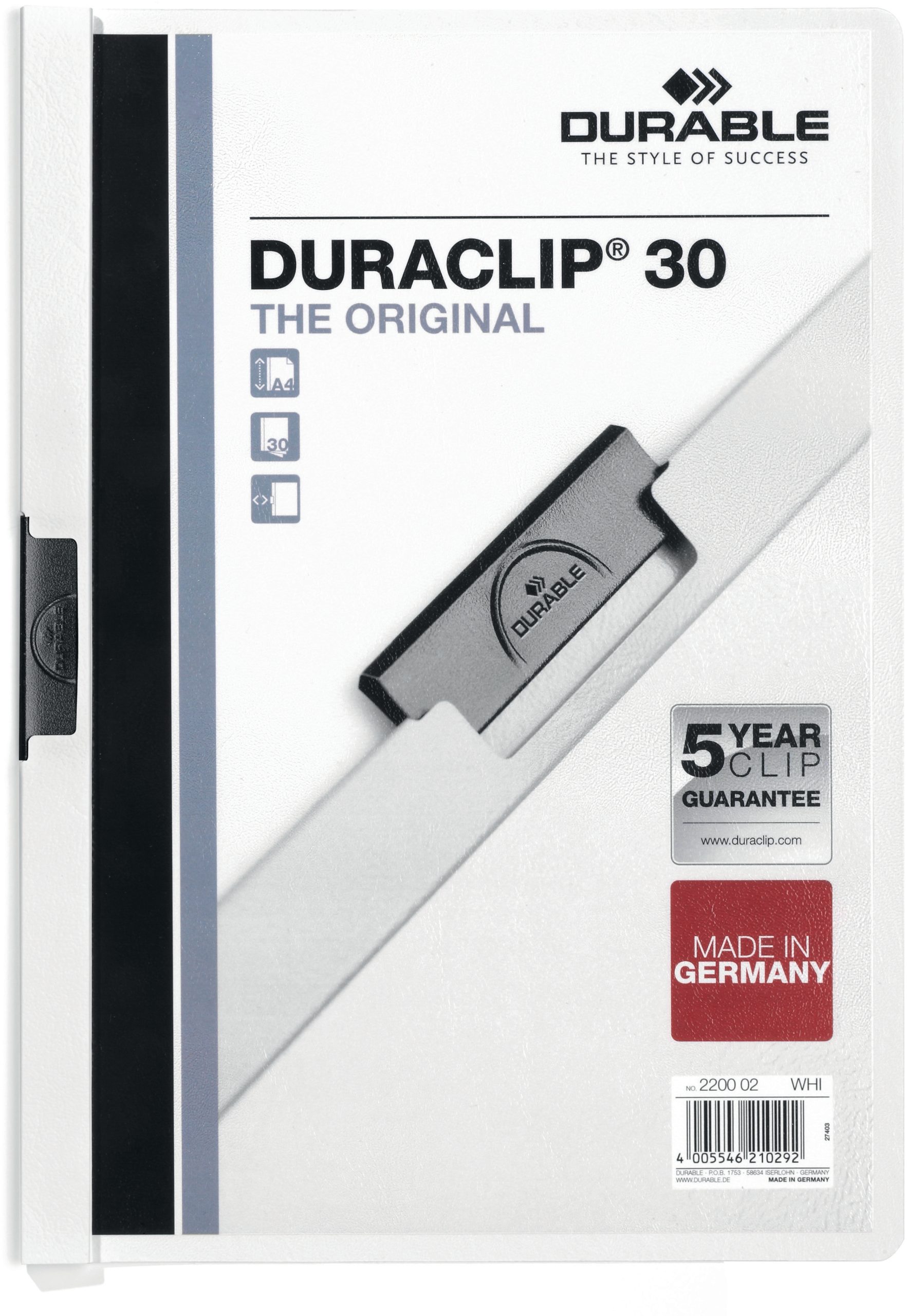 Der DURABLE Klemmhefter DURACLIP 30 in Weiss eignet sich ideal zur Aufbewahrung von bis zu 30 A4-Blättern und bietet eine praktische und elegante Lösung für Ihre Dokumentenorganisa