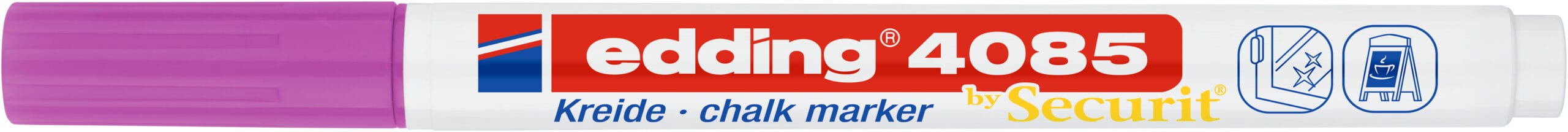 4085 – Kreidemarker für kreative Gestaltung und Beschriftung von Fenstern, Tafeln, Glas und Spiegeln. Deckende Flüssigkreide auf Wasserbasis mit 1-2 mm Strichbreite. Leicht abwischbar und geruchsneutral für nicht-permanente Designs.