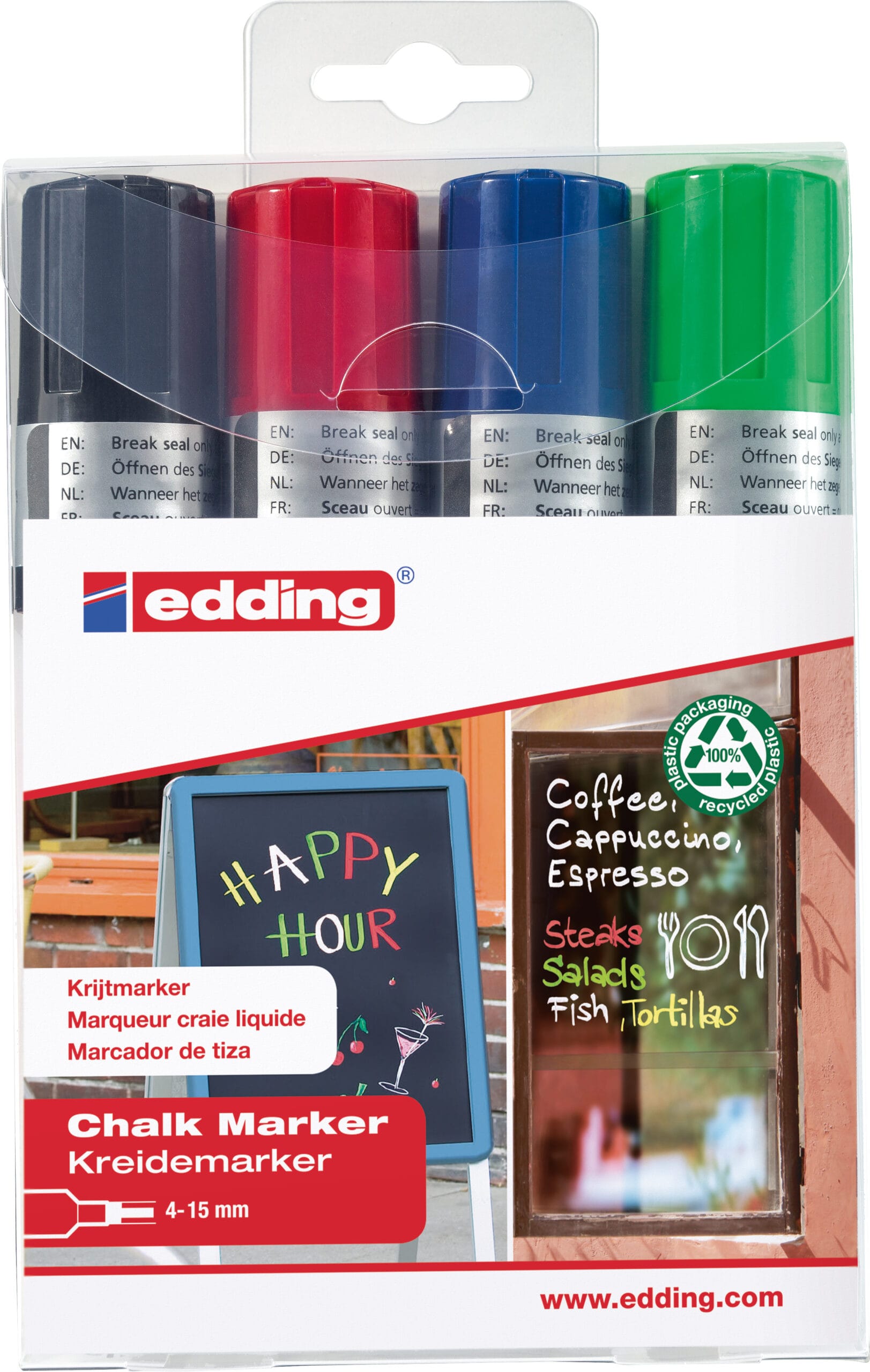 Mit dem EDDING 4090 Kreidemarker Sortiment kannst du dunkle Tafeln, Fenster, Glas und viele andere geschlossene Oberflächen kreativ gestalten, beschriften und verzieren. Dieser hochwertige Kreidemarker verleiht deinen Projekten Lebendigkeit und Farbenpracht.