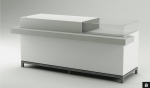 Eleganter Verkaufstresen in Weiß mit Taschenablage aus synthetischem Kroko-Leder