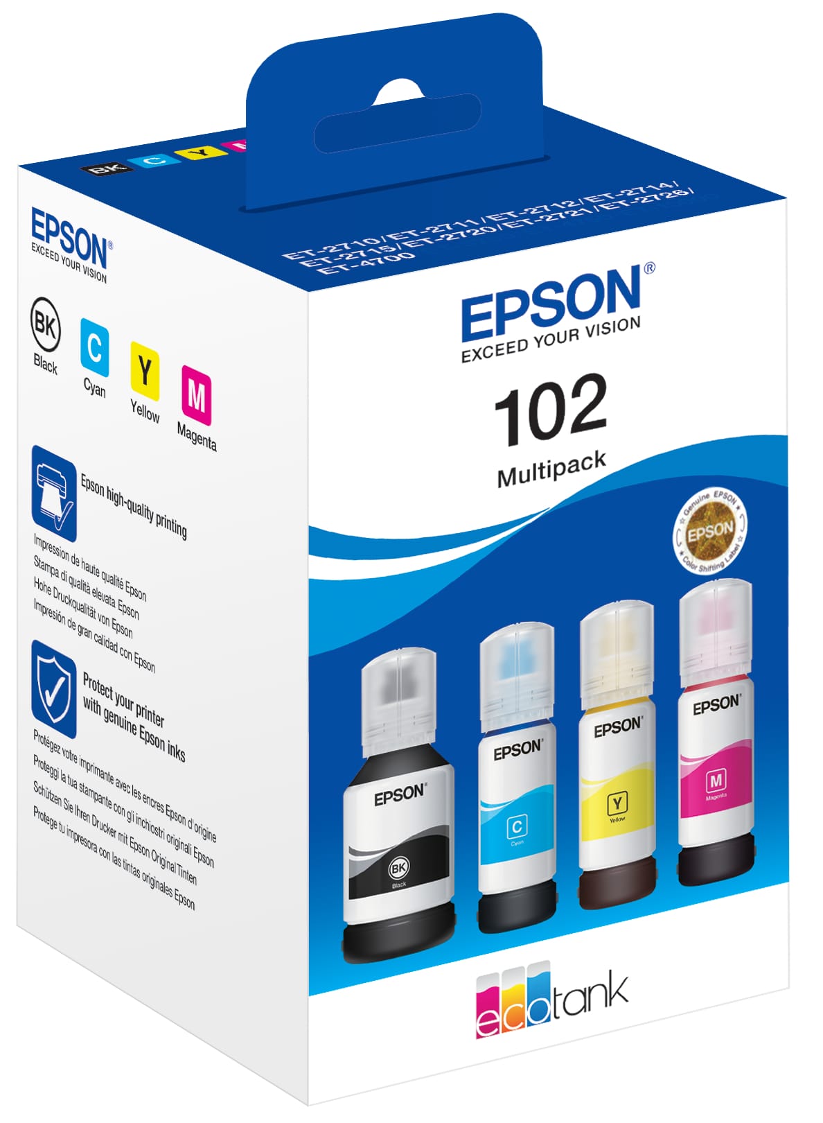 Mit dem 102 Tintenflasche Multipack erhalten Sie kostengünstige und praktische Tinten in vier Farben für hochwertige Druckergebnisse. Perfekt für EcoTank-Drucker, ermöglicht ein Set Tausende von gedruckten Seiten, ohne Patrone zu wechseln.uvwxyz