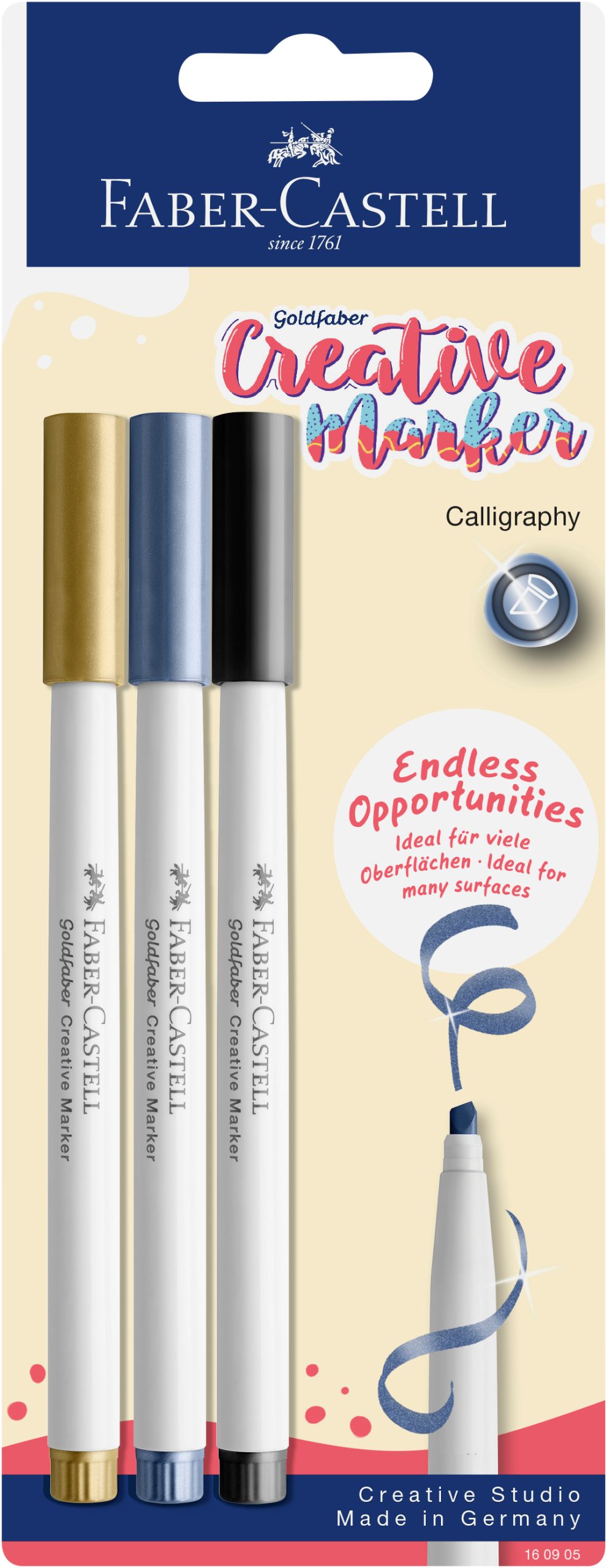 Die FABER-CASTELL Creative Marker mit Keilspitze in Metallic Farben sind die ideale Wahl für kreative Köpfe, die ihren Kunstwerken einen funkelnden Touch verleihen möchten. Mit diesem Set von drei Markern können Sie Ihre künstlerischen Ideen in leuchtenden Metallic-Tönen umsetzen und so besondere Akzente setzen.