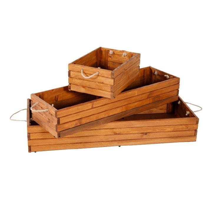 Eine faltbare Holzkiste aus massivem gebeiztem Kiefernholz ist eine äußerst praktische und dekorative Ergänzung für verschiedene Umgebungen. Ihr rustikaler Charme verleiht jedem Raum eine gemütliche Note, sei es in einem Café, Restaurant, Einzelhandelsgeschäft oder zu Hause. Mit ihren vielseitigen Nutzungsmöglichkeiten kann sie zum stilvollen Präsentieren von Speisen, Blumenarrangements oder Produkten dienen. Die seitlichen Seilgriffe ermöglichen einen einfachen Transport, während das faltbare Design Flexibilität und Platzersparnis bietet. Gönnen Sie sich diese robuste und langlebige Holzkiste, die Ihnen viele Jahre lang Freude bereiten wird.