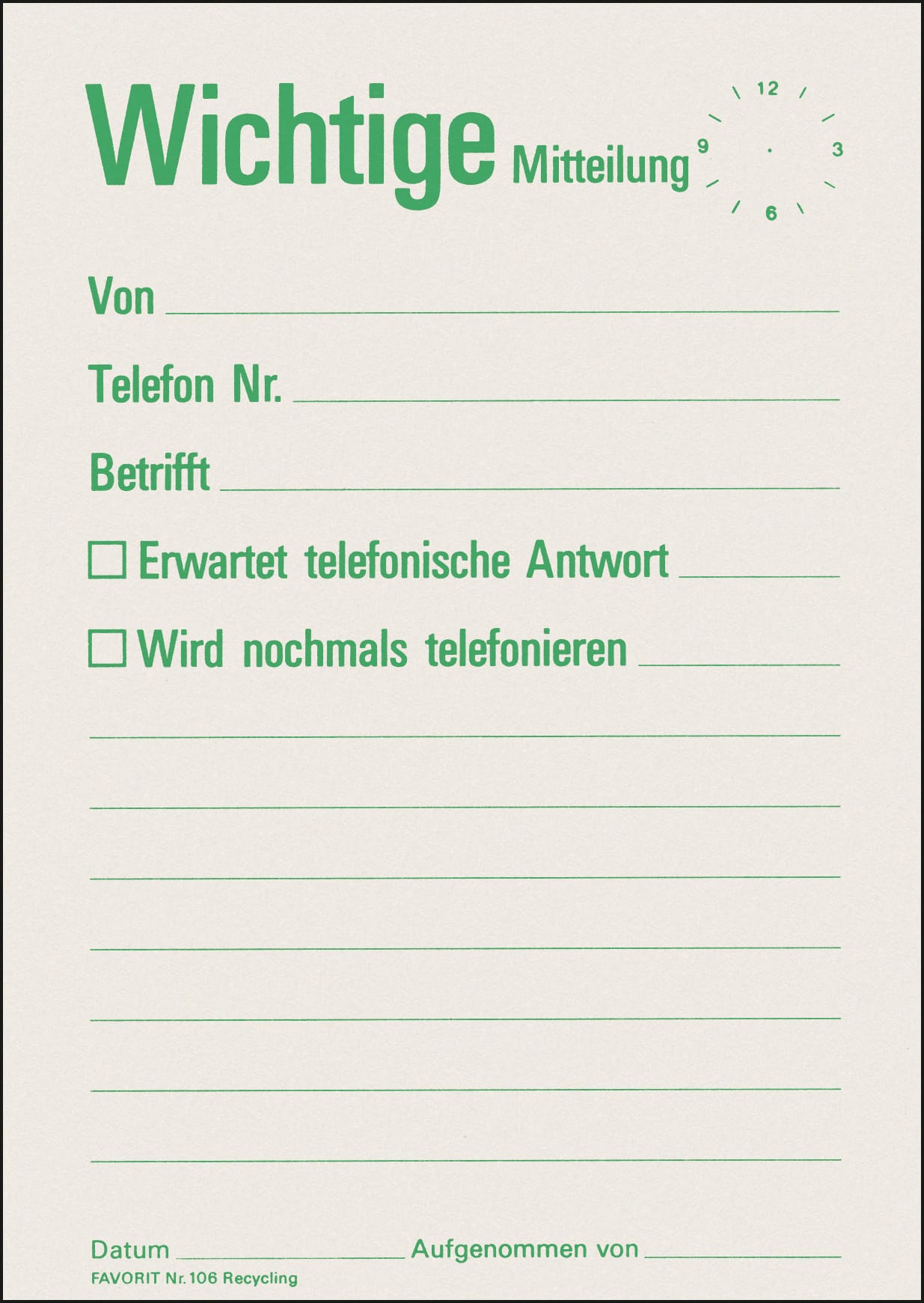 Mitteilungsblöcke A6 – Recycling für den alltäglichen Gebrauch im Büro. Diese geleimten Blöcke aus grün bedrucktem Recycling-Papier sind ohne Durchschrift. Ideal für umweltbewusste Notizen.
