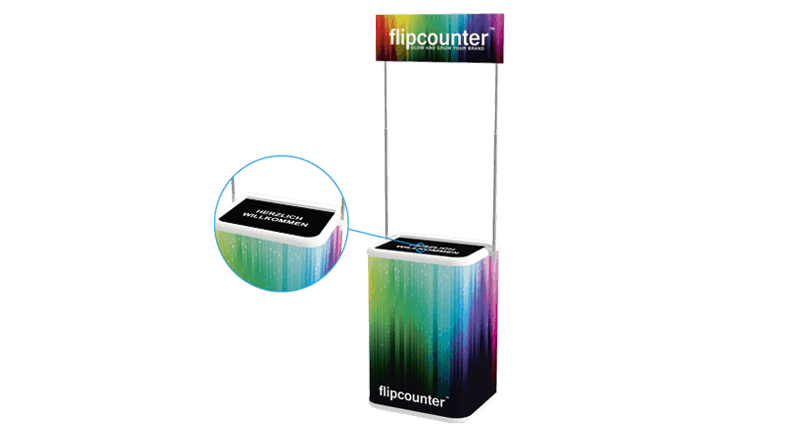 Die Theke flipcounter ist nicht nur äußerst leicht, sondern überzeugt auch mit einem modernen und praktischen Design. Dank der LED-Hinterleuchtung im Korpus wird Ihre Werbebotschaft oder Ihr Firmenlogo effektvoll in Szene gesetzt. Die kompakte Bauweise macht diese Theke ideal für Messen, Promotionaktionen oder Events.