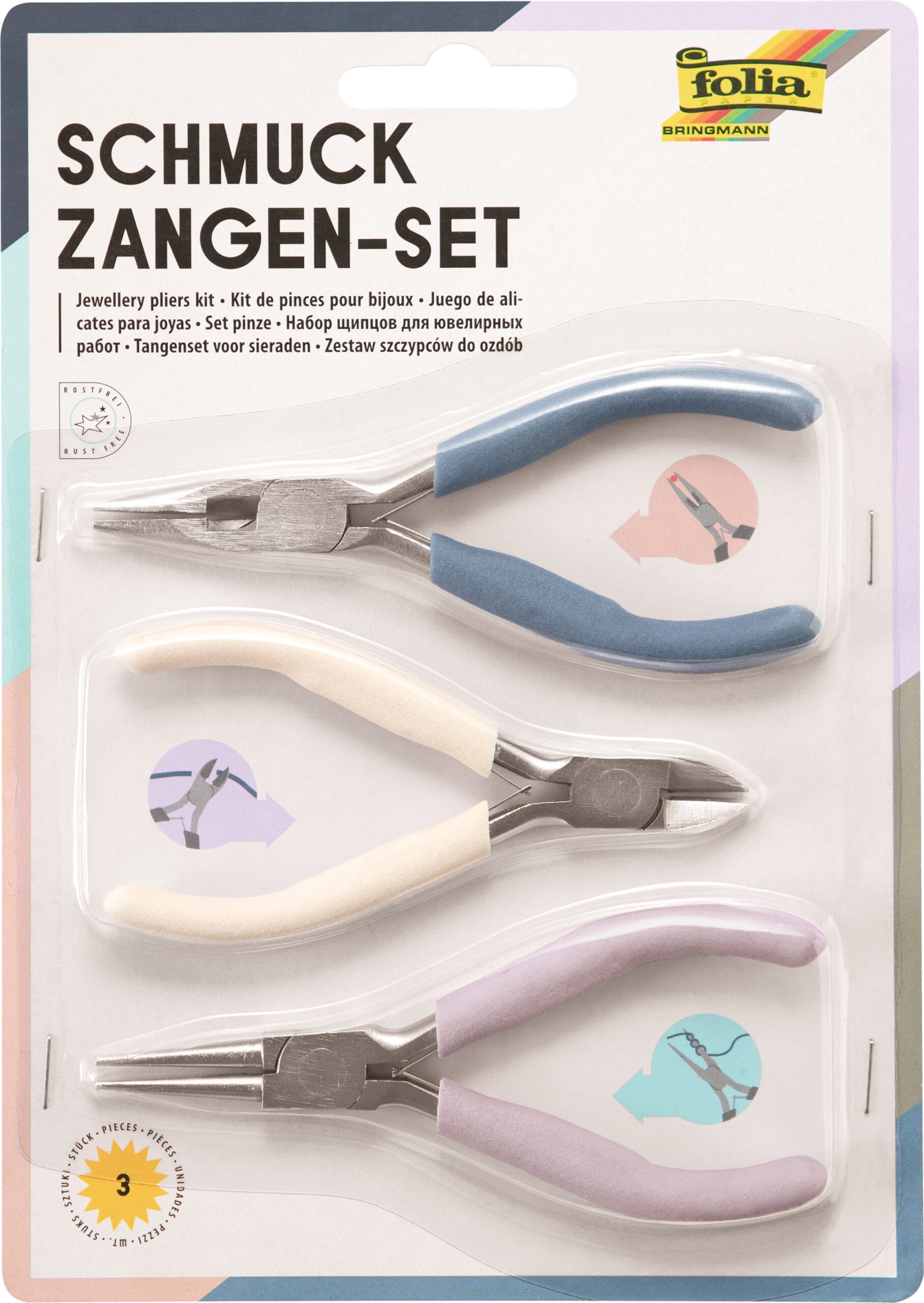 Das Set enthält eine Kombizange, einen Seitenschneider und eine Rundzange. Die Kombizange eignet sich hervorragend für verschiedene Tätigkeiten, während der Seitenschneider präzise Schnitte ermöglicht und die Rundzange perfekt für das Formen von Schmuckstücken ist. Damit haben Sie alle wichtigen Werkzeuge griffbereit, um Ihre kreativen Ideen umzusetzen.
