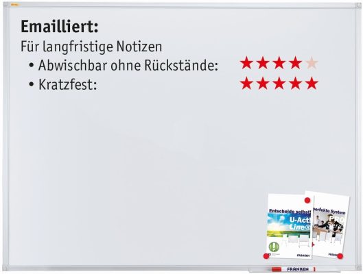 Mit dem X-TRA!LINE Whiteboard in den Massen 150 x 100 cm bist du bestens ausgestattet, um deine Gedanken festzuhalten, Ideen zu visualisieren oder wichtige Informationen zu präsentieren. Das Whiteboard ist magnethaftend, so dass du nicht nur Notizen und Dokumente anheften, sondern auch direkt darauf schreiben kannst. Dank der lackierten Oberfläche ist das Board beschriftbar und trocken abwischbar, sodass du es immer wieder verwenden kannst.