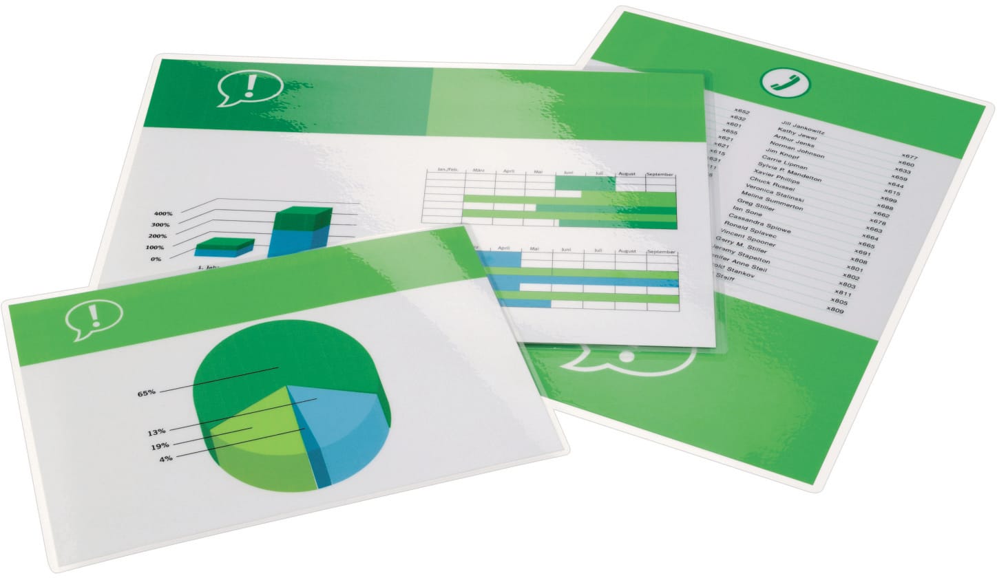 Mit den Heisslaminier-Folientaschen sind deine oft genutzten Dokumente wie Präsentationen, Referenzlisten oder Produktblätter optimal aufgewertet und geschützt. Die glänzende Oberfläche verleiht deinen Unterlagen das gewisse Etwas.
