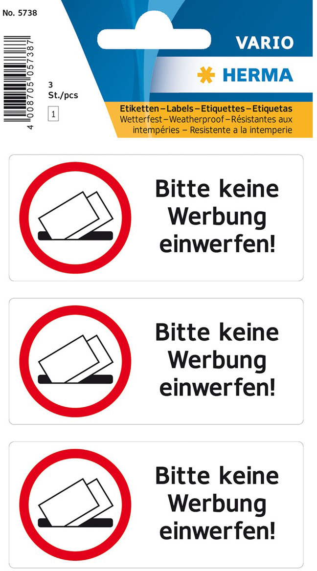 Die HERMA Hinweis-Etiketten 5738 „Keine Reklame“ sind eine praktische Lösung für alle, die unerwünschte Werbung an ihrer Haustür oder im Briefkasten vermeiden möchten. Dieses Set besteht aus drei hochwertigen Etiketten, die durch ihre klare Botschaft und einfache Handhabung überzeugen.