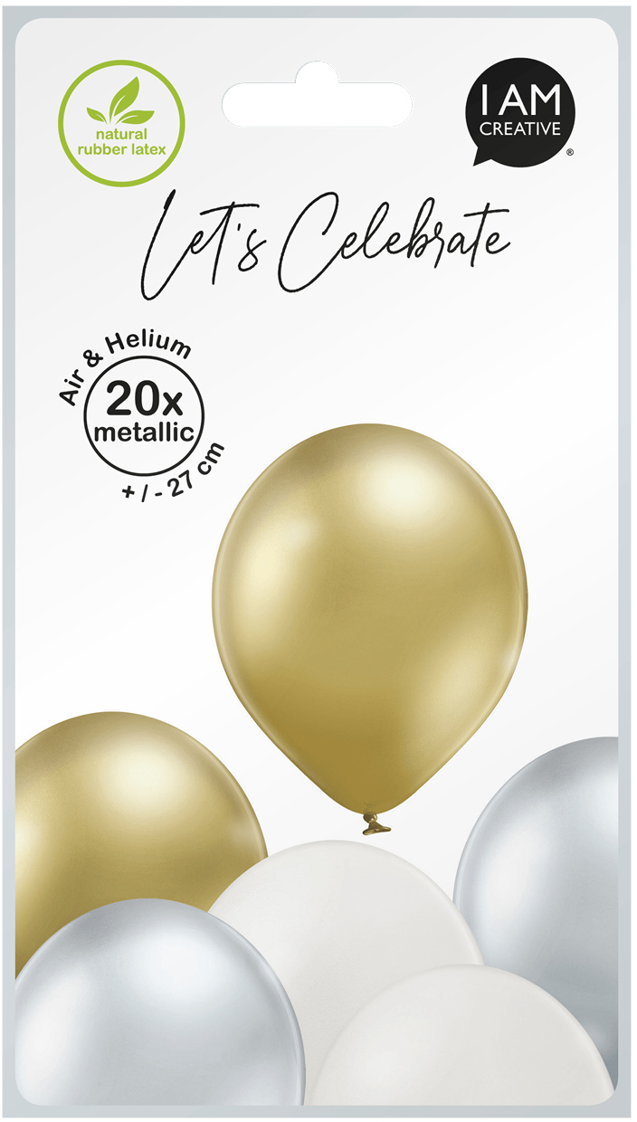 Die I AM CREATIVE Ballons im Metallic Mix (27 cm) in creme, gold und silber sind ideal für festliche Anlässe. Das Set enthält 20 hochwertige Ballons für kreative Dekorationen.