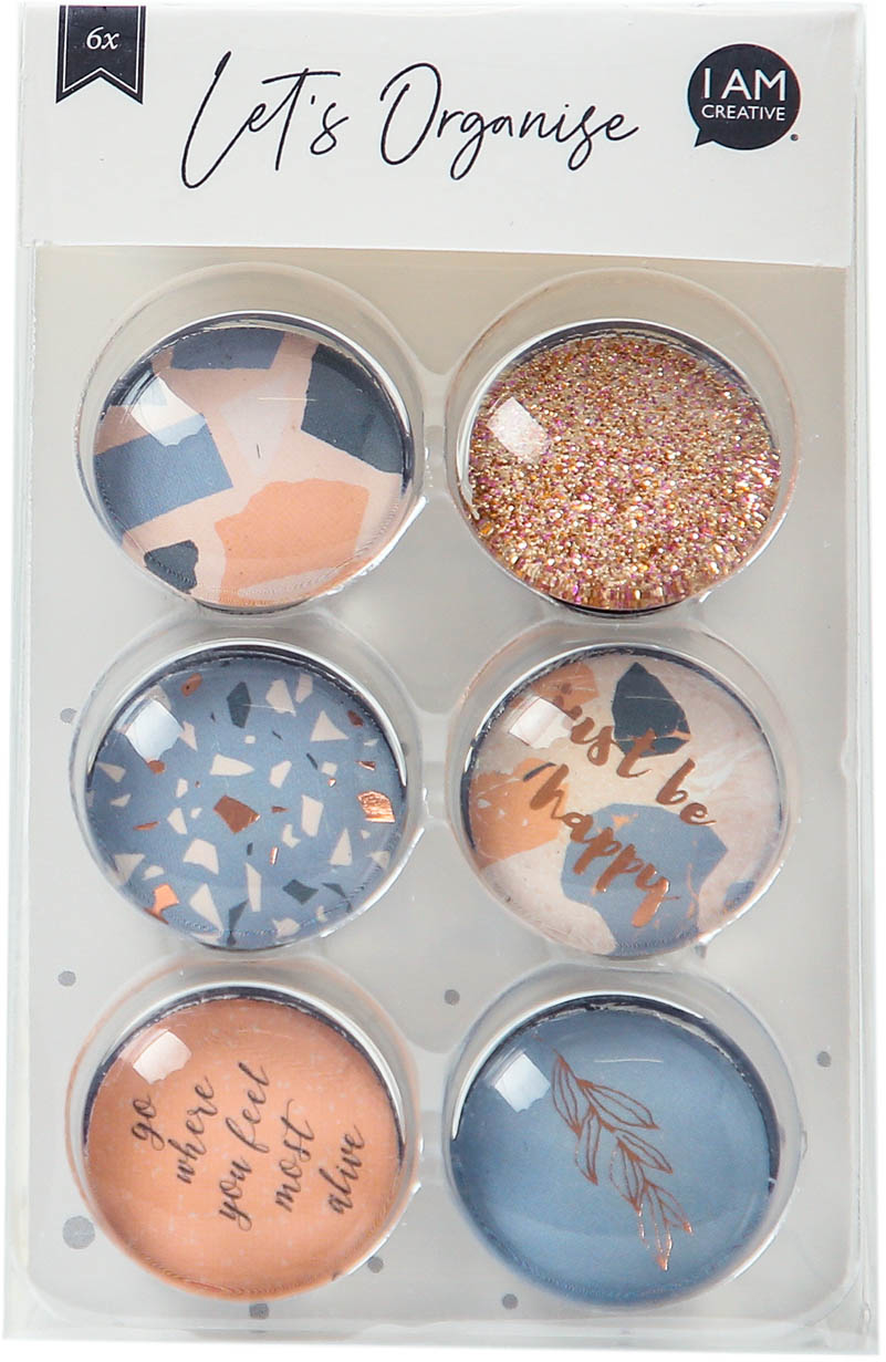 Entdecke die I AM CREATIVE Magnet Happy Let’s Organize! Diese 6 Glas-Magnete (2.5x1cm) sind perfekt, um deine Notizen stilvoll zu organisieren.