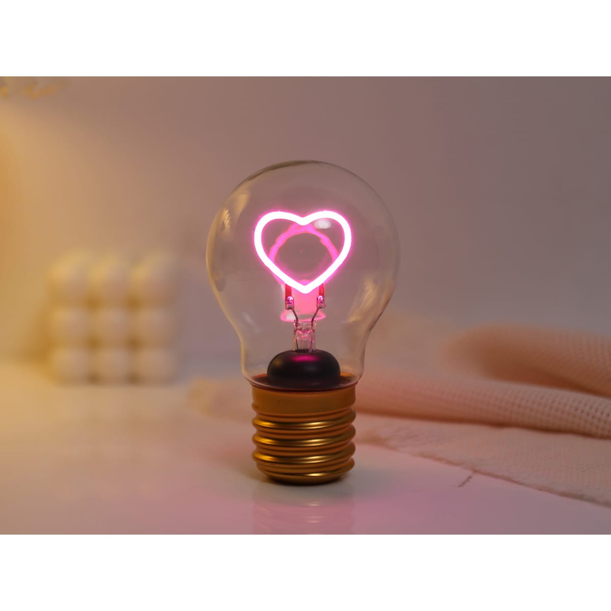 Die Tischlampe in Form einer Glühbirne mit pinkem Herz-Motiv ist die ideale Wahl, um eine romantische Atmosphäre in Ihrem Zuhause zu schaffen. Mit ihrem warmen gelben Licht eignet sie sich perfekt zur Dekoration von Schlafzimmern, Kinderzimmern oder Büros. Stellen Sie sie einfach auf ein Regal oder einen Tisch und lassen Sie sich von ihrem gemütlichen Schein verzaubern.