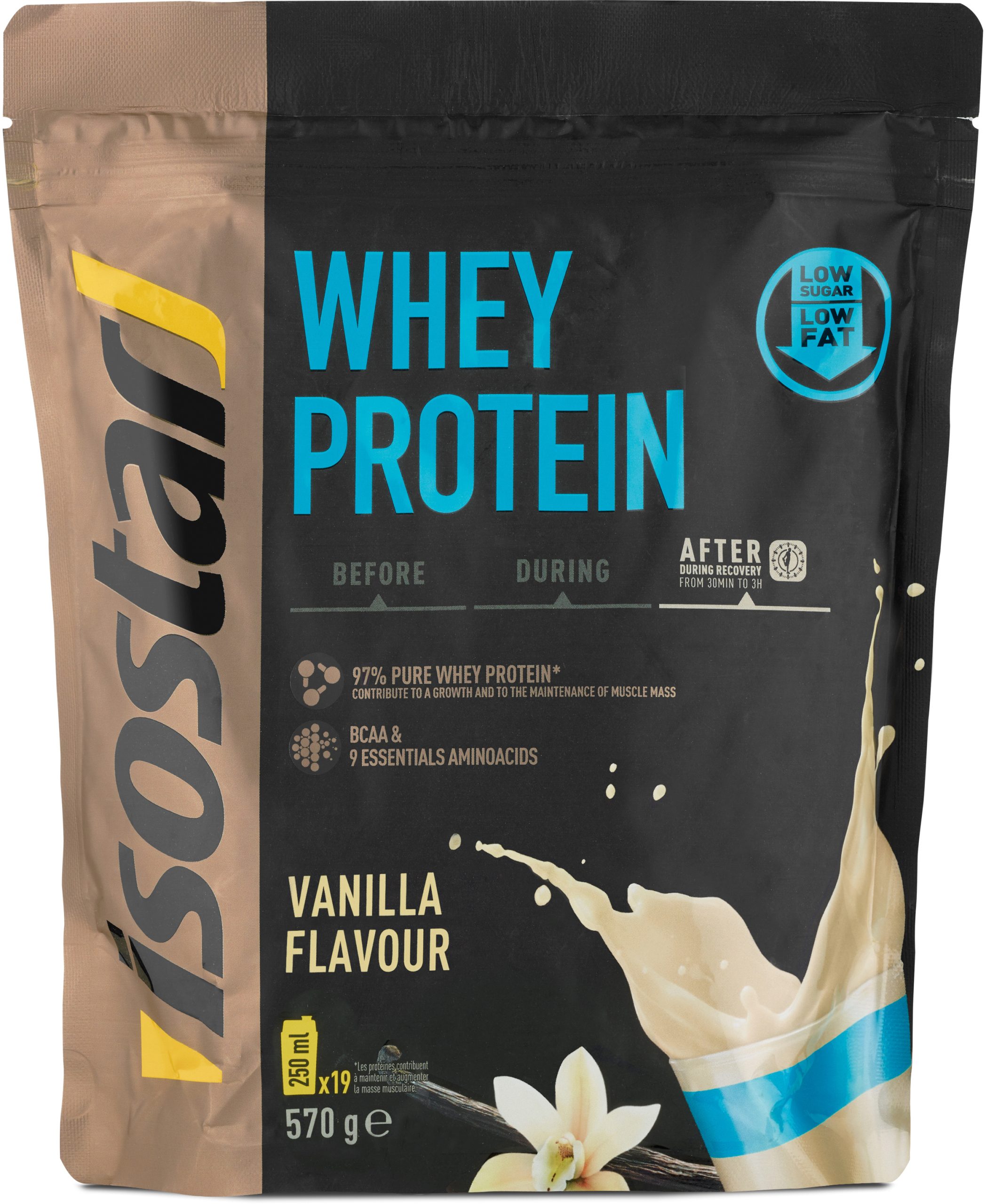 Isostar Whey Protein Vanille ist konzentriertes Molkenpulver zur Herstellung eines Proteinshakes mit allen essenziellen und insbesondere verzweigtkettigen Aminosäuren (BCAA). Der intensive Vanille-Geschmack macht dies zu einem leckeren Proteinshake vor oder nach dem Training.