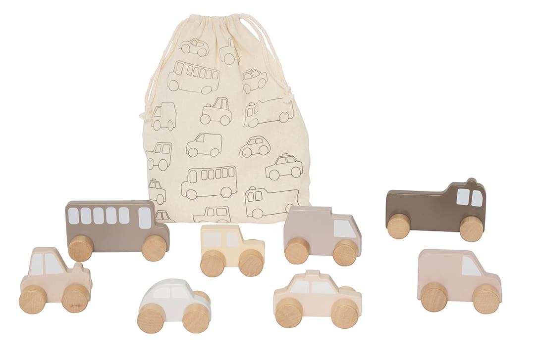 Erstes Auto für die Kleinsten: 8 süsse Fahrzeuge in Naturfarbe, sicher auf stabilen Rädern. Praktisch verpackt im Stoffbeutel, ideal zum Mitnehmen. Aus FSC®-zertifiziertem Holz. Masse: 4 cm x 3 cm.