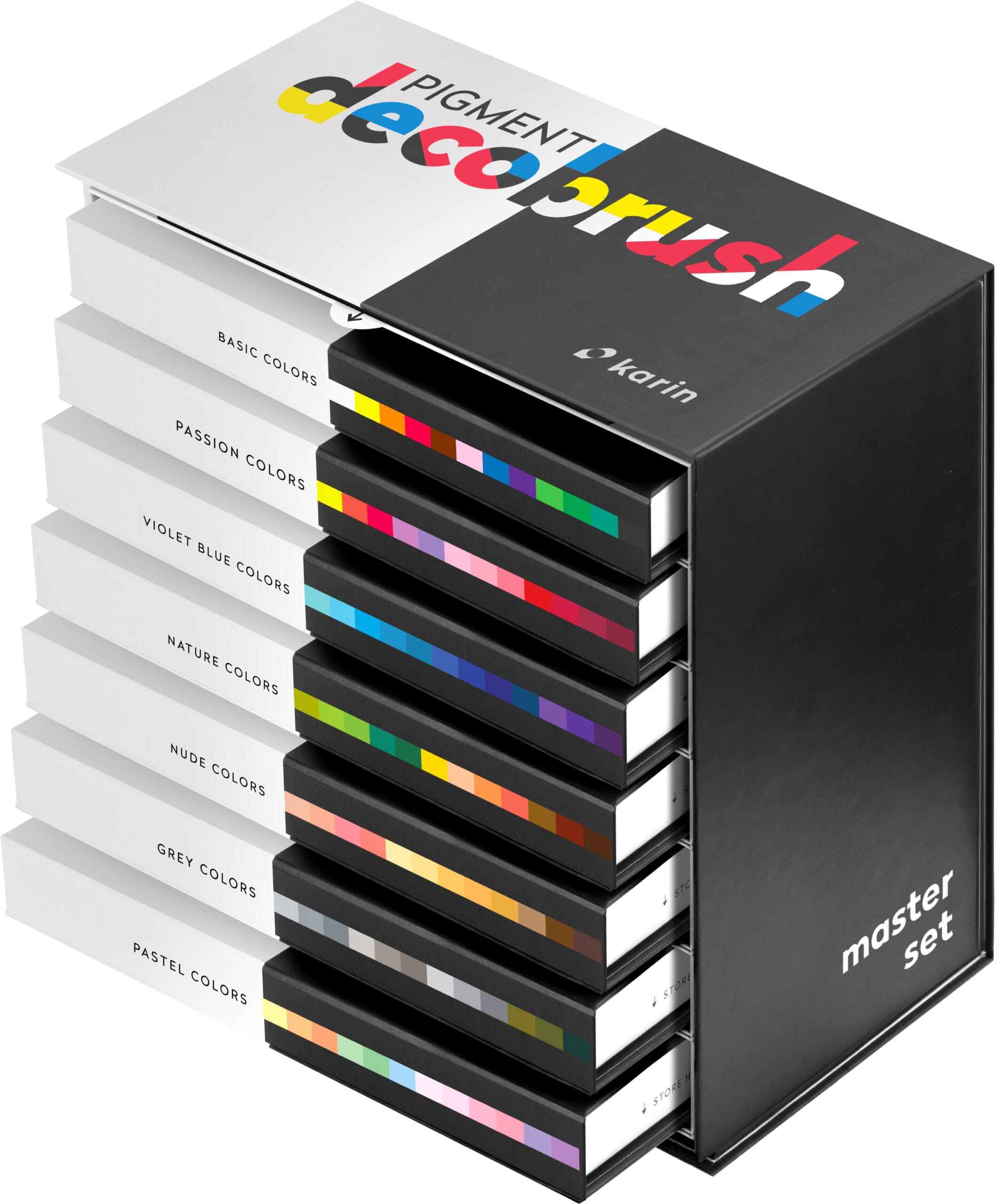 Das PIGMENT decobrush MASTER Set beinhaltet insgesamt 84 Pinselmarker aus verschiedenen Kollektionen: Basic, Passion, Violet-Blue, Nature, Nude, Grey und Pastel. Diese vielseitige Auswahl an Farben ermöglicht es dir, eine breite Palette an Projekten umzusetzen. Das Set wird in einem exklusiven Etui geliefert, das nicht nur die Marker schützt, sondern auch eine praktische Aufbewahrung und Transport ermöglicht.