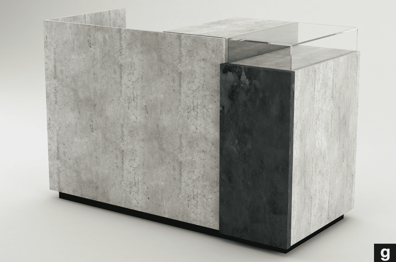 Diese Verkaufstheke besticht durch ihr modernes Design in Betonoptik, kombiniert mit echtem schwarzen Steinfurnier an der Front. Die Glasabdeckung oben rundet das elegante Erscheinungsbild ab und macht die Theke zu einem Blickfang in jedem Verkaufsraum.