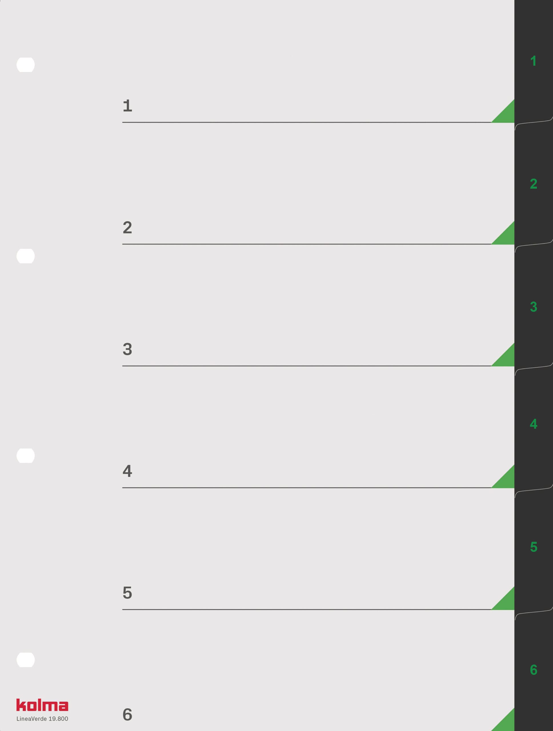 Das Register enthält ein Textblatt mit auffälligen grünen Ecken, das entweder mit dem Kolma Creator auf www.kolma.swiss personalisiert werden kann oder ganz einfach von Hand beschriftet werden kann. So behalten Sie stets den Überblick über den Inhalt. Ein weiterer Pluspunkt ist die ovale Lochung, die ein müheloses Umblättern und eine praktische Handhabung gewährleistet.