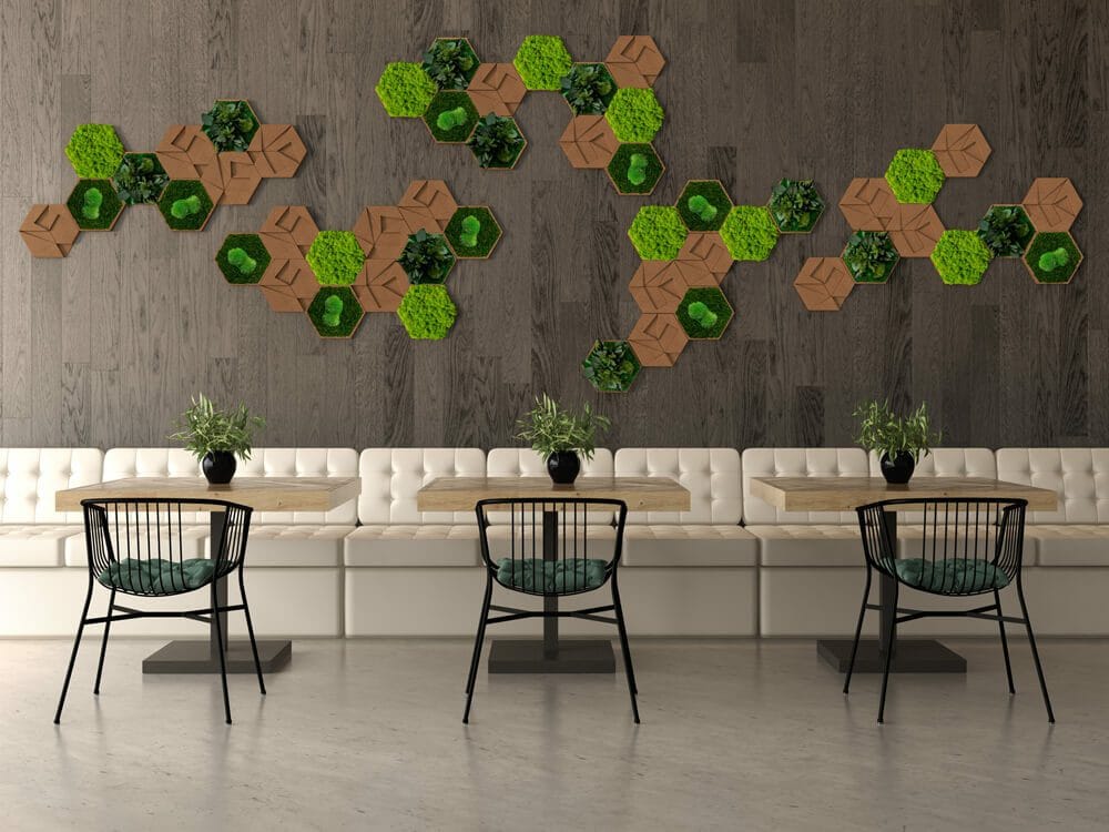 Die Hexagone bestehen zu 100% aus natürlichem Kork, während die Begrünung aus echtem, konserviertem Islandmoos und anderen Pflanzenelementen besteht. Diese Materialien sorgen nicht nur für einen authentischen Look, sondern verbessern auch das Raumklima.