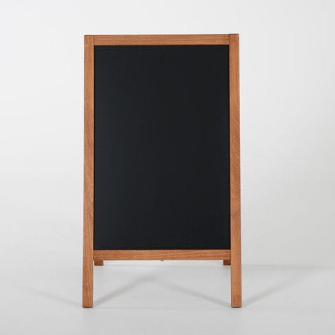 Dieser Kundenstopper vereint Funktionalität mit einem ansprechenden Äußeren. Die massive Premium-Tafel in elegantem Schwarz wird von einem Rahmen aus dunkel gebeiztem Buchenholz umrahmt, was dem Kundenstopper eine edle Optik verleiht. Das hochwertige Holz strahlt Wärme aus und schafft eine gemütliche Atmosphäre, sowohl im Innen- als auch im Außenbereich.