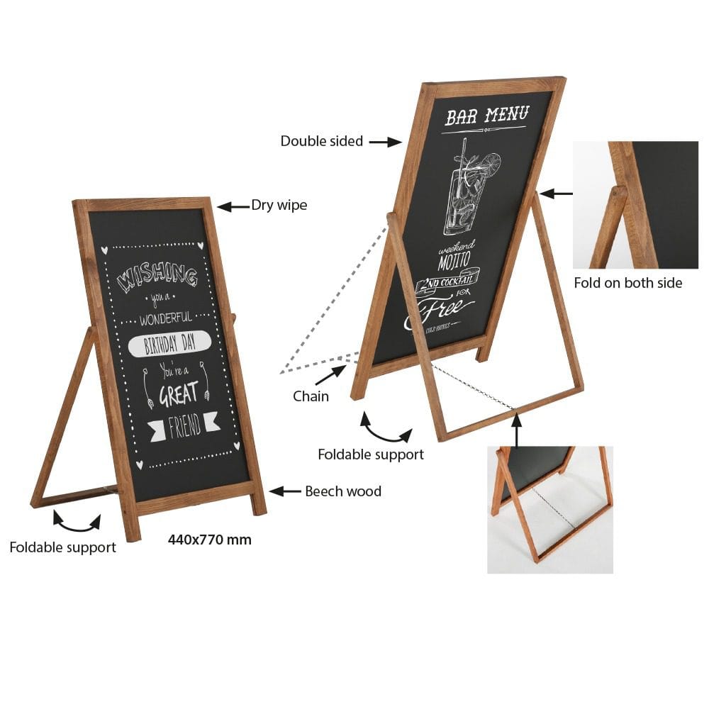 Der einseitige Kundenstopper Nala aus hochwertigem Massivholz ist die perfekte Lösung, um Ihre Informationen sowohl im Innen- als auch im geschützten Außenbereich beeindruckend zu präsentieren. Die Kreidetafel aus Massivholz ermöglicht es Ihnen, Ihre Botschaften mit Kreidemarkern kreativ zu gestalten und klar zu kommunizieren.