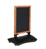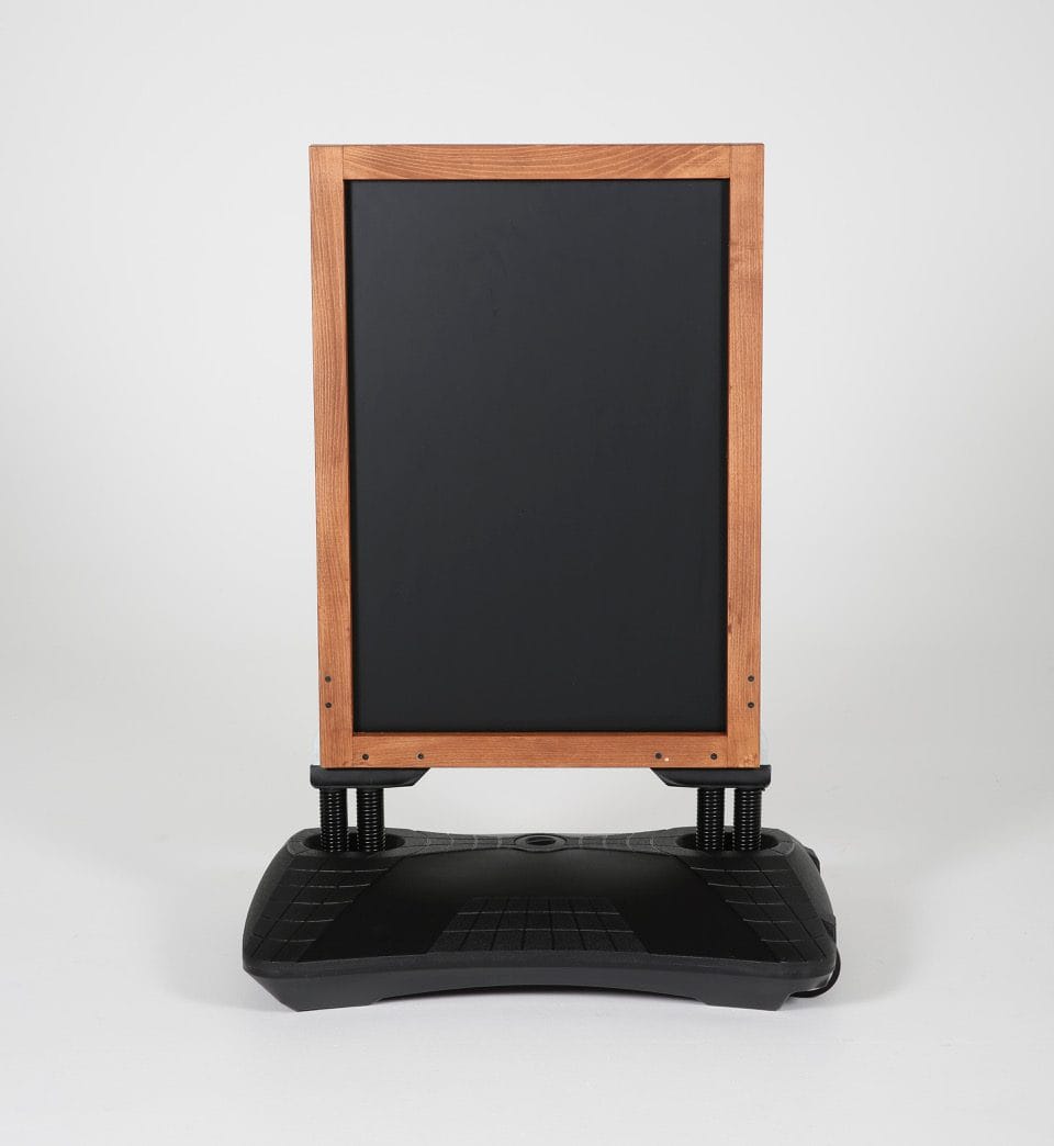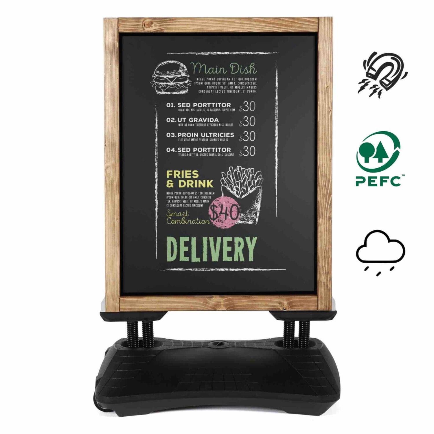 Der vielseitige Kundenstopper eignet sich für den Innen- und Außenbereich. Mit einer hochwertigen massiven Premium-Tafel in elegantem Schwarz, umgeben von einem dunkel gebeizten Buchenholzrahmen, fügt er sich harmonisch in jedes Umfeld ein. Die großzügige Schriftfläche von 590 x 780 mm bietet ausreichend Platz, um Ihre Informationen effektiv zu präsentieren.
