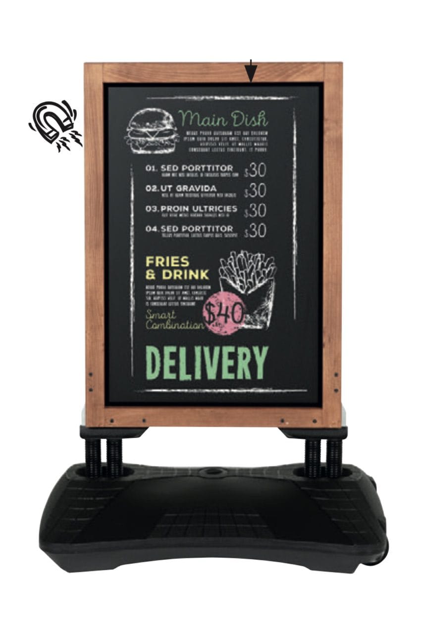 Neben der Nutzung von Kreidemarkern kann die Tafel auch als magnetische Oberfläche genutzt werden. So haben Sie die Möglichkeit, zusätzliche Informationen oder Aushänge anzubringen. Der Behälter des Kundenstoppers kann mit Wasser oder Sand gefüllt werden, um eine stabile Positionierung sicherzustellen, selbst bei starkem Wind.