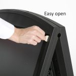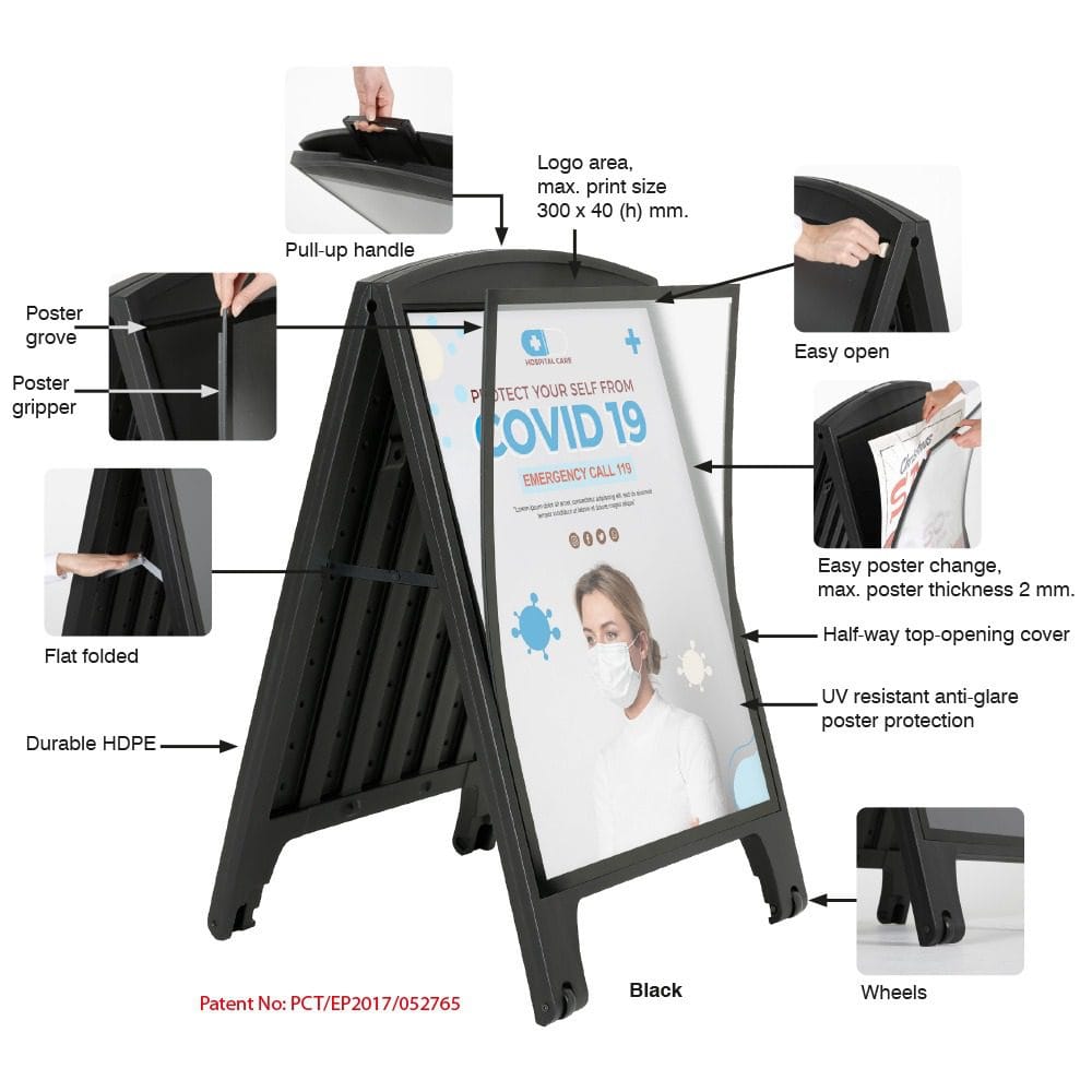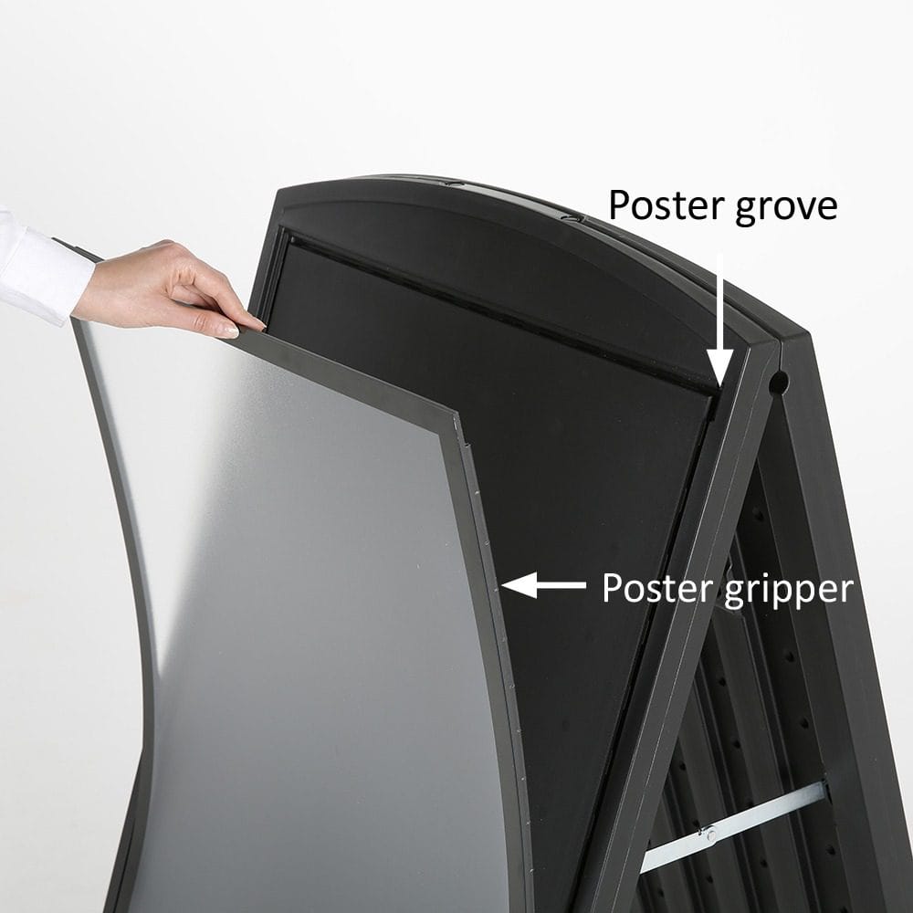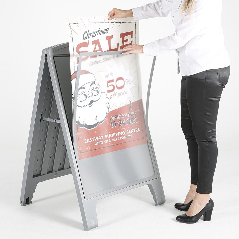 Der Street SignPro Deco ist ein beeindruckender doppelseitiger Schilderrahmen aus strapazierfähigem Kunststoff, der Platz für zwei A1-Schilder bietet. Dank seiner vertieften Gestaltung werden Ihre Posterflächen optimal geschützt. Zudem verfügt der Rahmen über einen praktischen eingeformten Griff, der den Transport erleichtert.