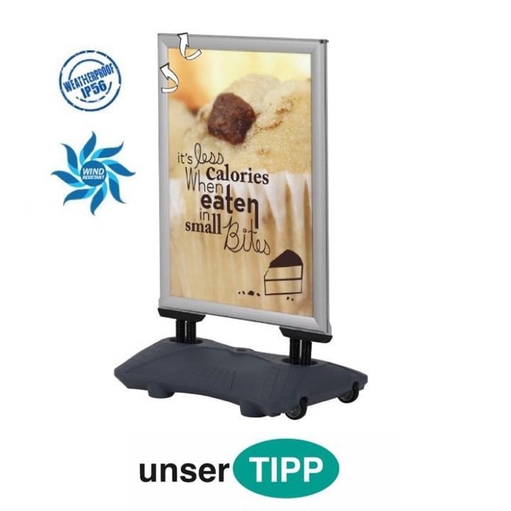 Erhältlich in verschiedenen Größen (wie A1, A0, B1, B2 oder F0) passt sich der Kundenstopper WindPro Plus individuellen Anforderungen an. Wählen Sie das passende Format für Ihre Werbebotschaft.
