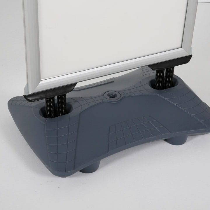 Der Fuß des Kundenstoppers kann je nach Bedarf mit Wasser oder Sand befüllt werden, um zusätzliche Stabilität zu gewährleisten. So bleibt der Aufsteller auch bei ungünstigen Wetterbedingungen sicher an Ort und Stelle.